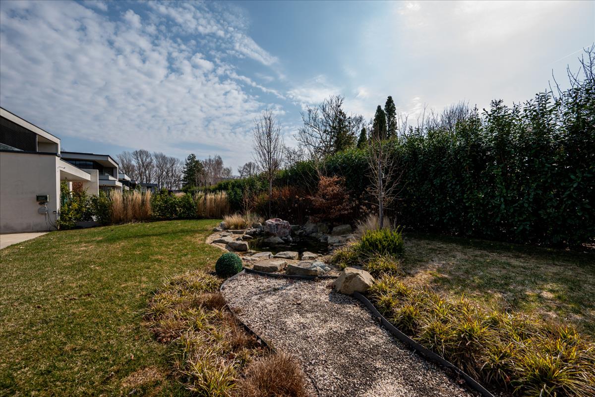 A kertben egyedi tervezésű japán zen kert található kerti tóval, automata feltöltő és öntözőrendszerrel, valamint hangulatos kertvilágítással, amely különleges atmoszférát teremt.