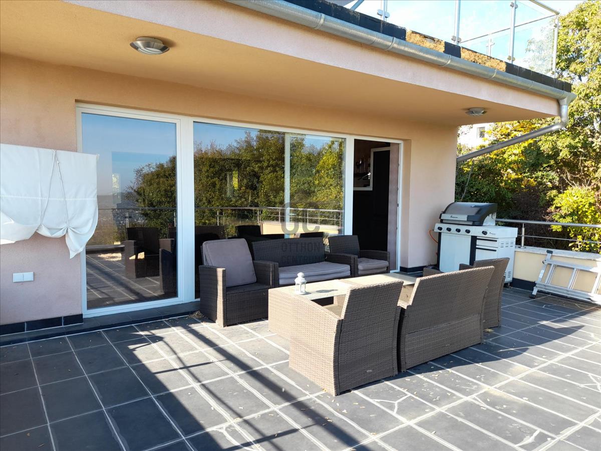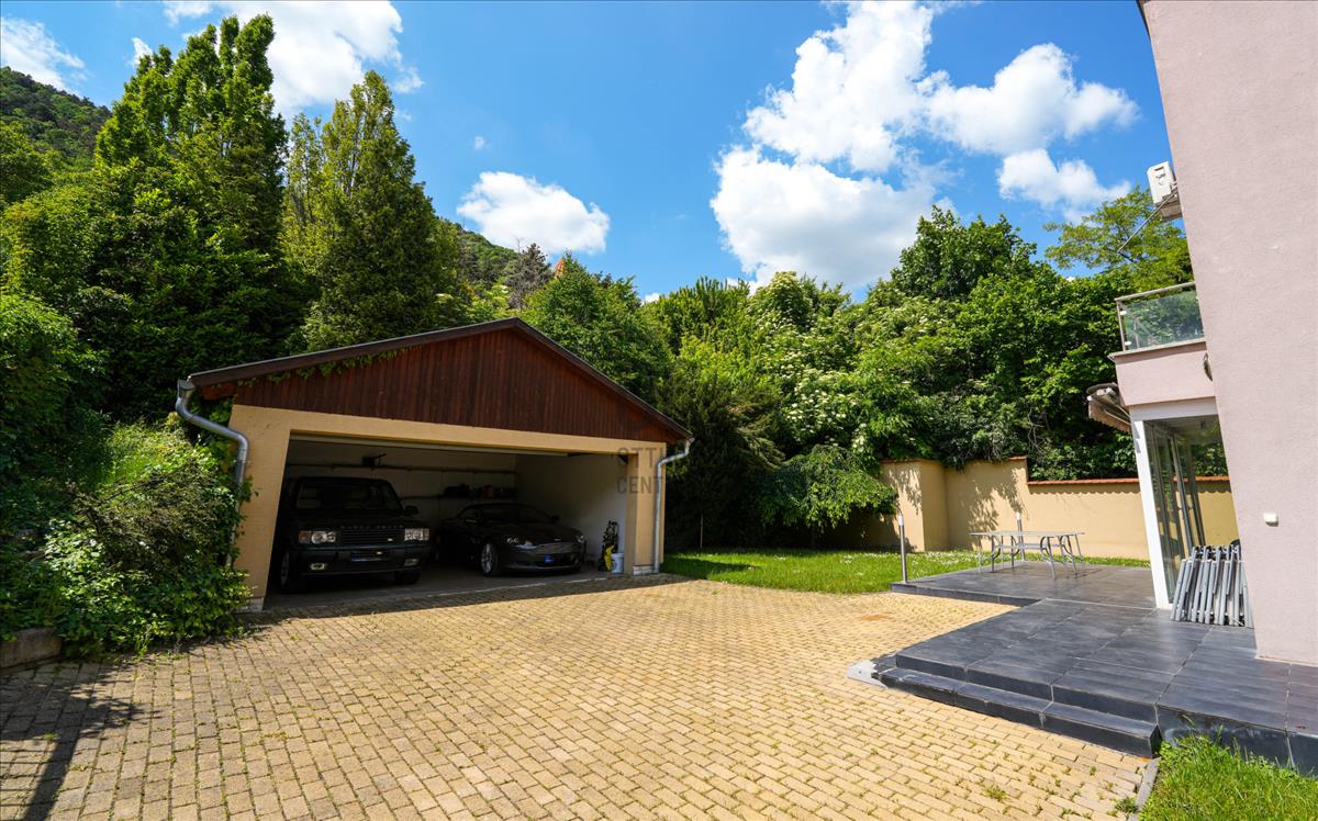 Itt az étkezőből egy, a ház teljes szélességében elnyúló üvegfalon keresztül elérhető az impozáns panorámát nyújtó terasz, ideális helyet adva a grillezéshez, baráti összejövetelekhez nyári estéken. Az enyhén lejtős telek adottságaiból adódóan a nappalival egy szinten található a 40 nm nagyságú, a fő épülettől különálló garázs is.
