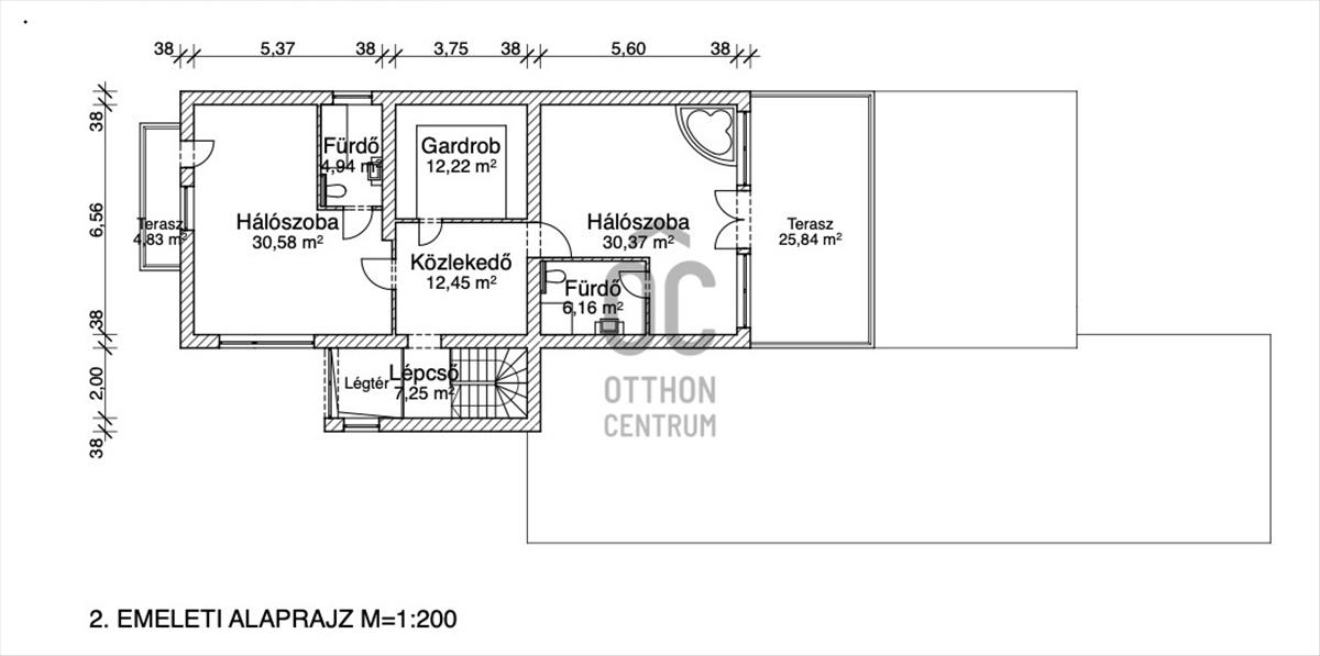A második szintre kényelmes lépcsőn lehet feljutni, ahol egy gyermekszoba, egy panorámás hálószoba nagy, szintén panorámás terasszal, két fürdőszoba és egy gardrób kapott helyet.