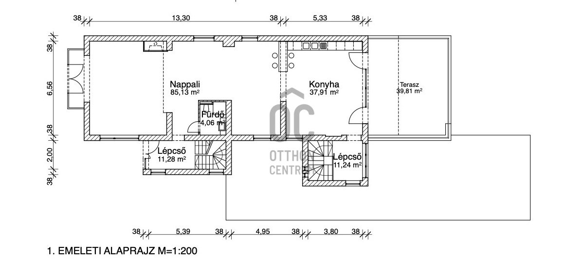 Az első emeleten a legtöbbet használt nappali - konyha - étkező együttes kivételes luxust és életteret adva szinte egy teljes szintet foglal el, összesen 123 négyzetméteren.