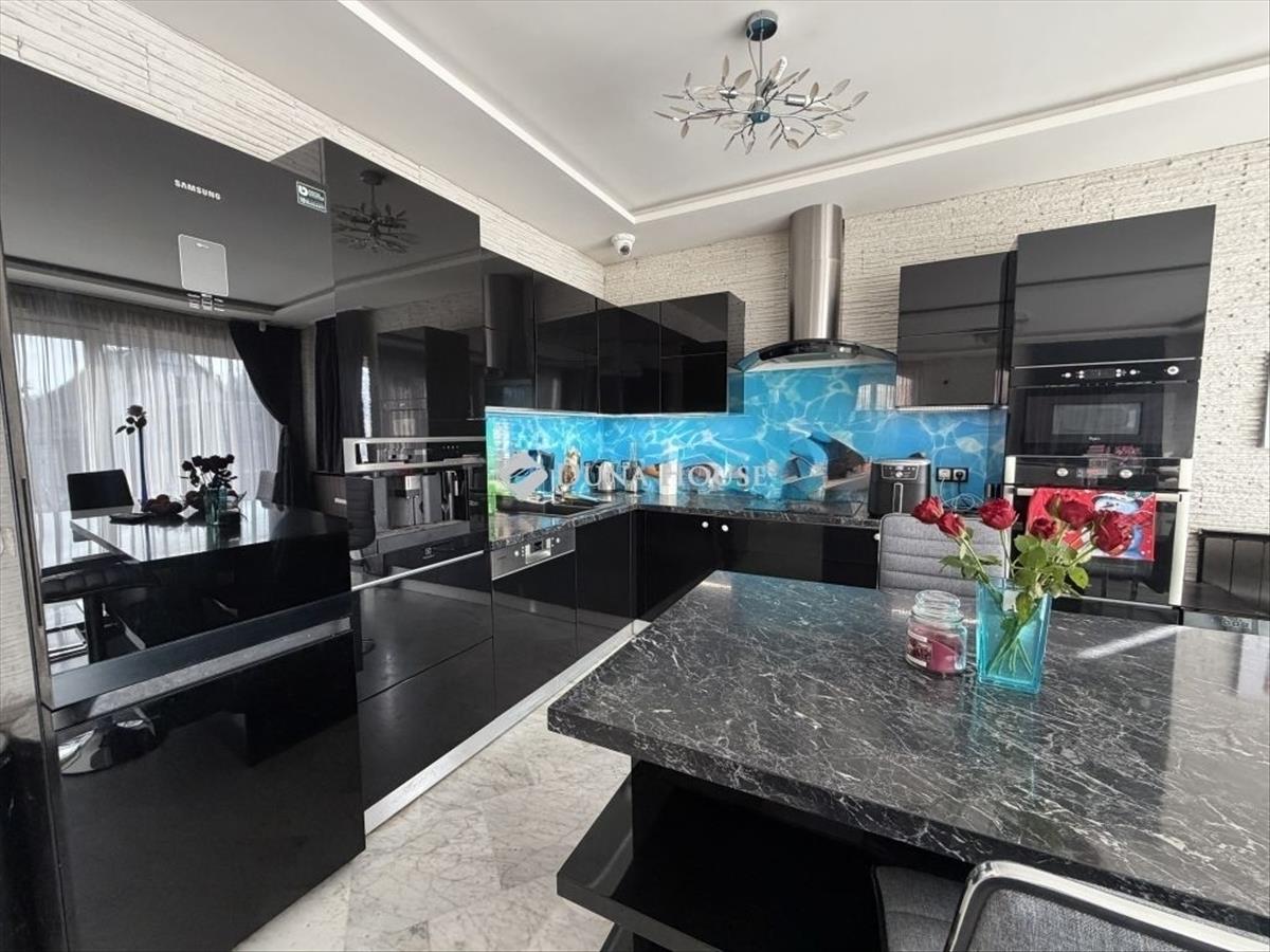 A konyhában magasfényű, prémium minőségű beépített konyhabútor található, praktikus elrendezéssel.