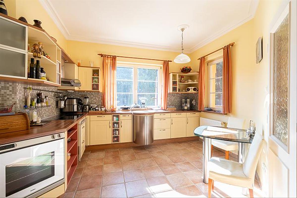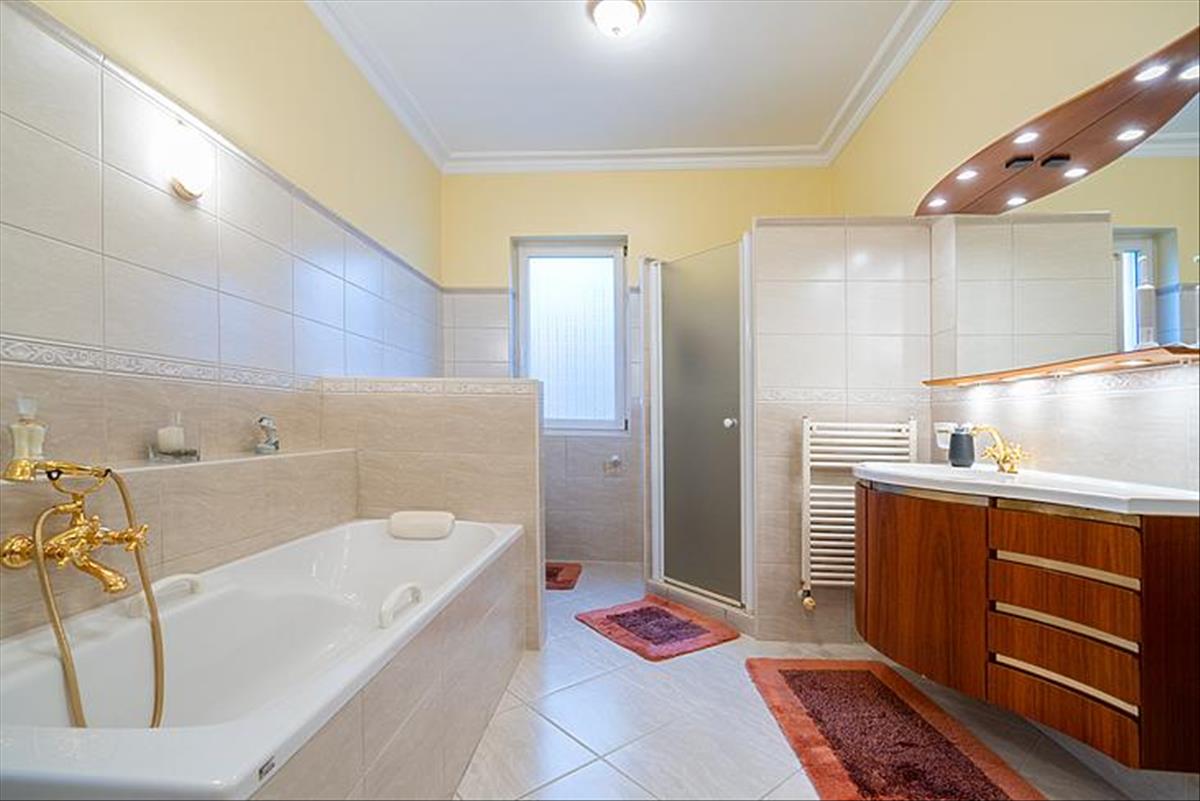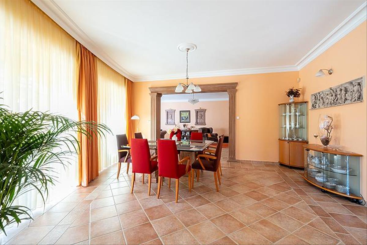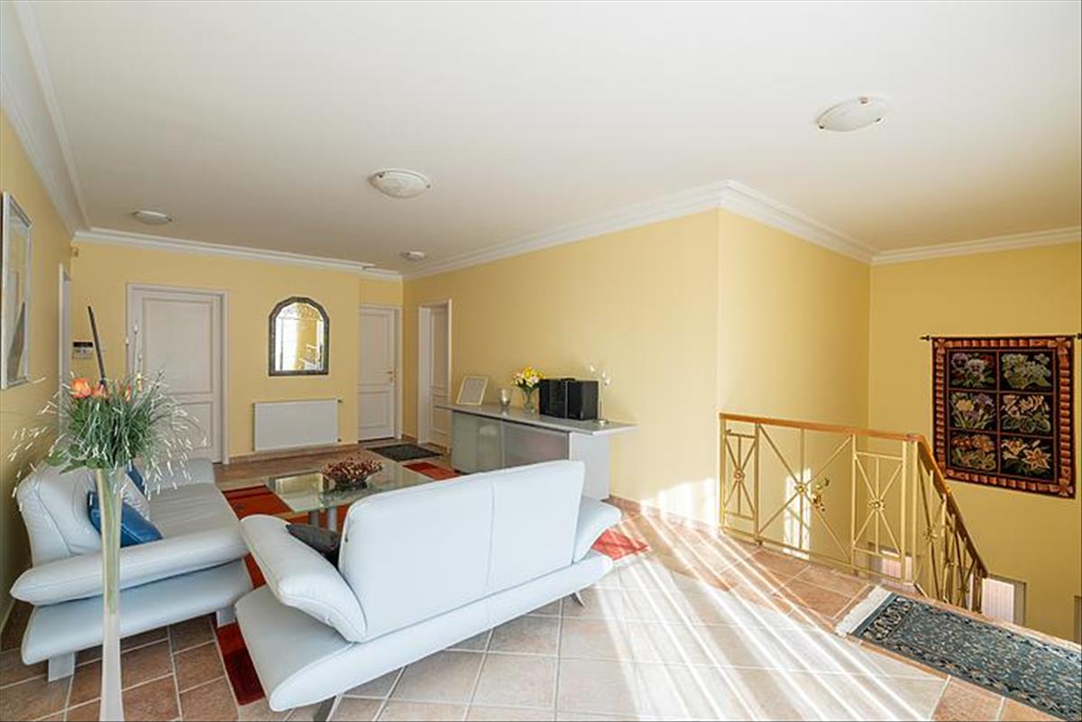 A tágas belső terek 3 méteres belmagassággal rendelkeznek, az ingatlan összesen 8 szobával, 3 fürdőszobával és egy vendég WC-vel szolgálja a család kényelmét. Az alsó szinten egy nagy terasz, míg az emeleten két további terasz biztosít kellemes pihenőhelyet. a konyha prémium aeg készülékekkel felszerelt, a főzéshez indukciós főzőlap és kivezetett szagelszívó áll rendelkezésre.