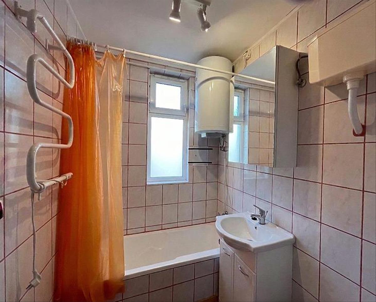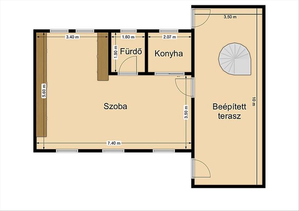 Jelenlegi elosztása a földszinten konyhából, kádas fürdőszobából és egy tágas térből áll, ahol egy térelválasztó könyvespolc és egy egyedi beépített tükrös gardróbszekrény található. a külön bejáratú emelet egy szobából és fürdőből áll, amely még befejezésre vár.