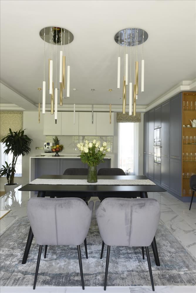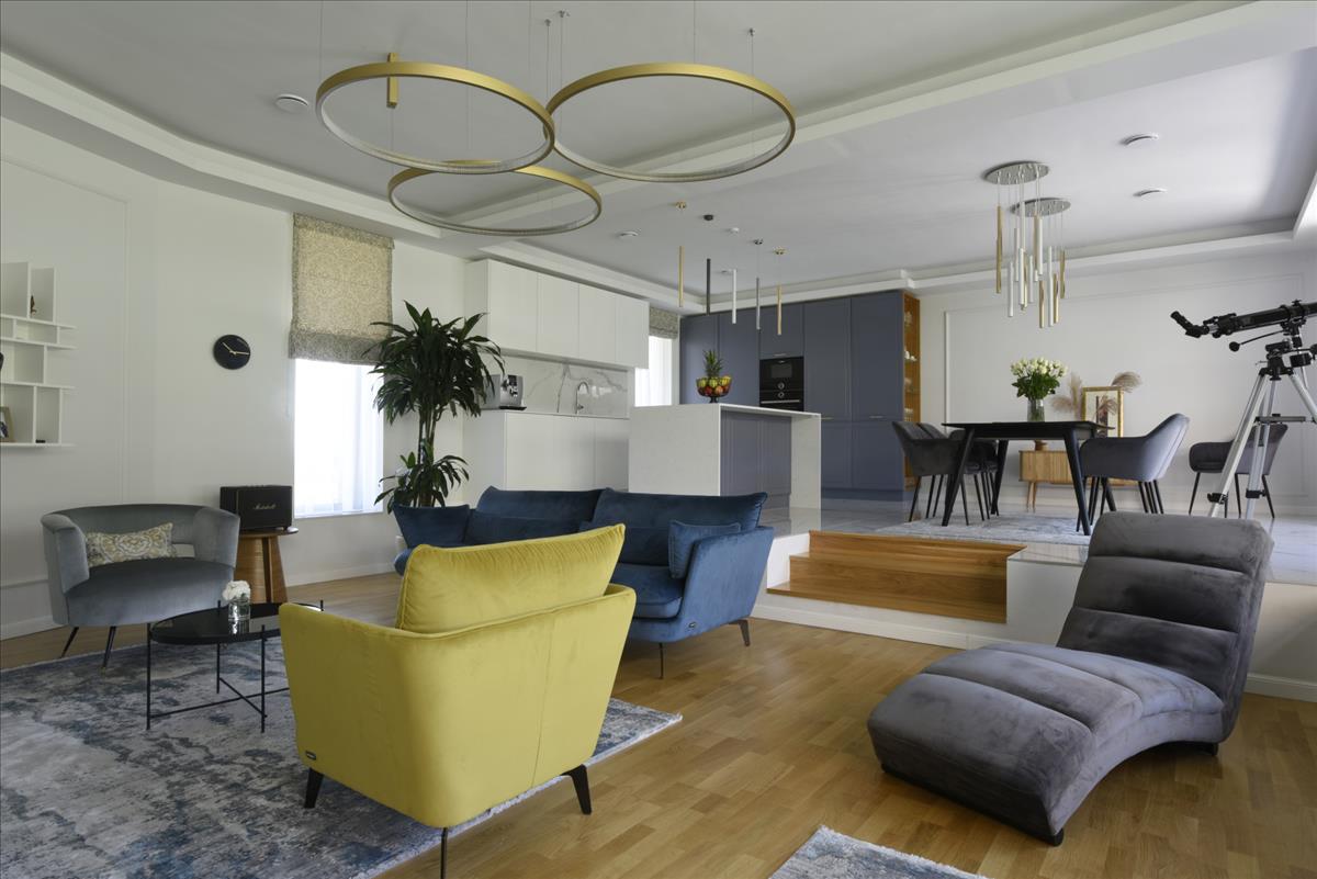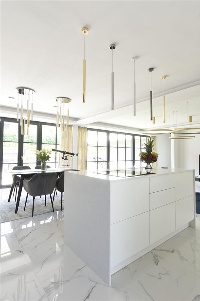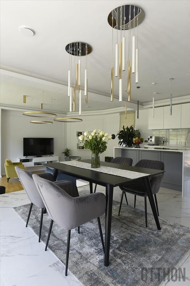Az eklektikus berendezést kiválóan osztják fel a belső téri szinteltolások. a konyha-étkező egy szintre került a kerttel, ahonnan három lépcsőfokkal lejjebb találjuk a nappalit. Ez a szerencsés mozdulat a nappali négyzetes osztású ablakai előtt teljes hosszban végigfutó tároló elhelyezését tette lehetővé, az innen feltáruló nappali pedig korántsem túlzó méretű, otthonos élettér. Ezt erősítik a világítótestek is, amelyek bár a leginkább vegyes képet mutatják (a ´30-as éveket idézőtől a manapság gyakran felbukkanó ledes körlámpákig találunk példát megoldásokra) nagyon ügyesen tagolják a tereket.