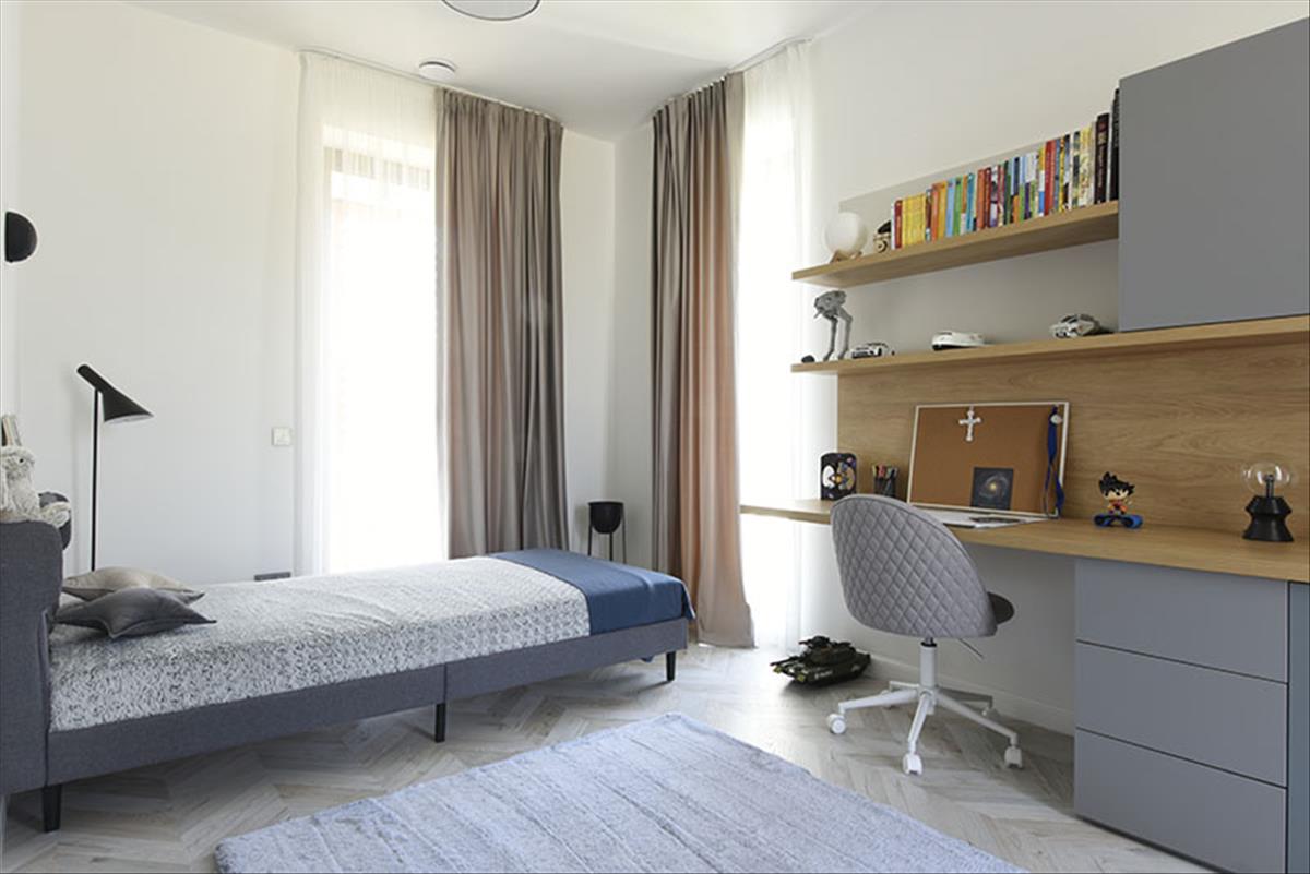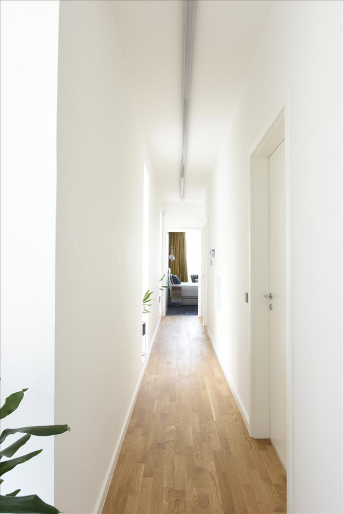 A földszintről forduló nélküli, hosszú lépcsőn juthatunk fel a kert felé hangolt emeletre, ahol a telekhatárhoz közel eső, azzal párhuzamosan vezetett folyosóról nyílnak a hálószobák (kivéve a saját fürdővel ellátott szülői hálót). a hosszú folyosót három nyílászáró osztja szolidabb léptékűvé, melyeknek (a homlokzaton ki is hangsúlyozott) szándékosan mély keretezése miatt semmilyen külső behatás sem zavarja a térélményt, miközben a falfelületeken meg-megtörő fény egyenletes megvilágításba vonja a folyosót.