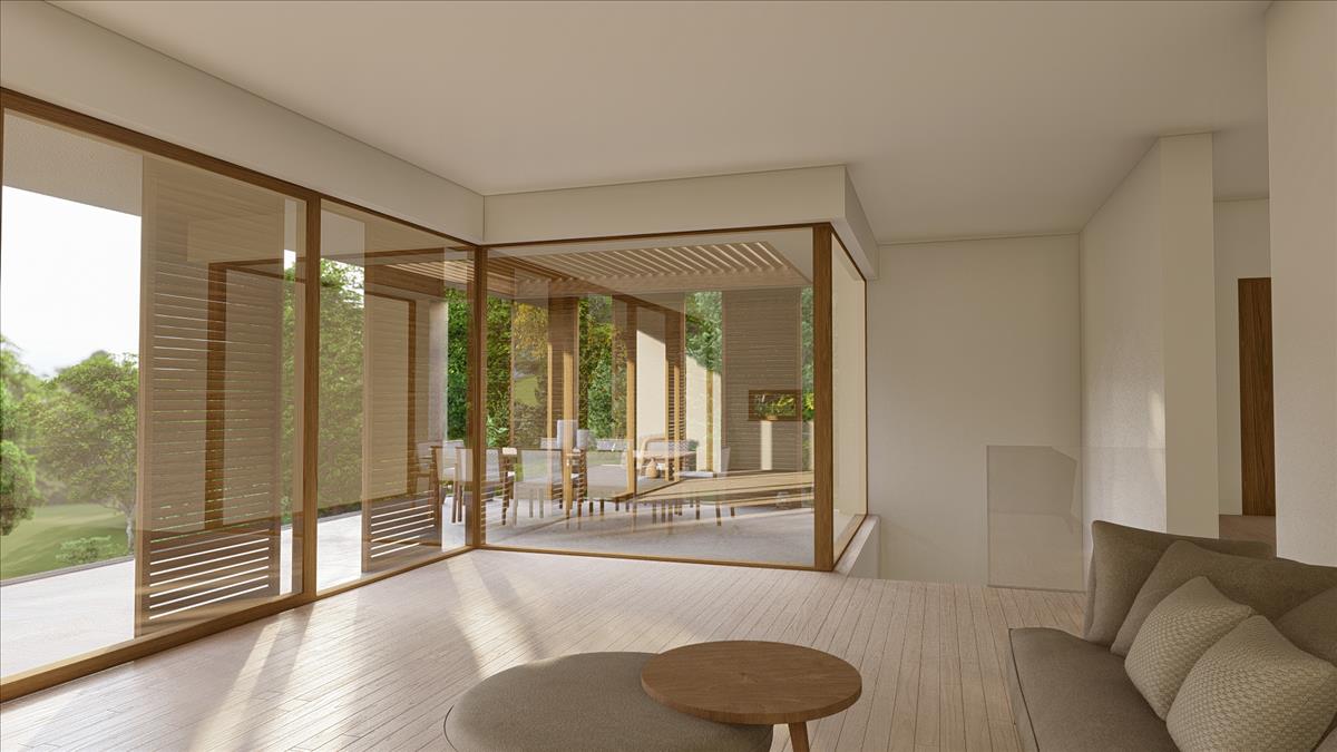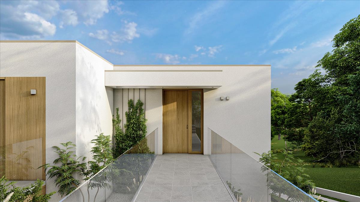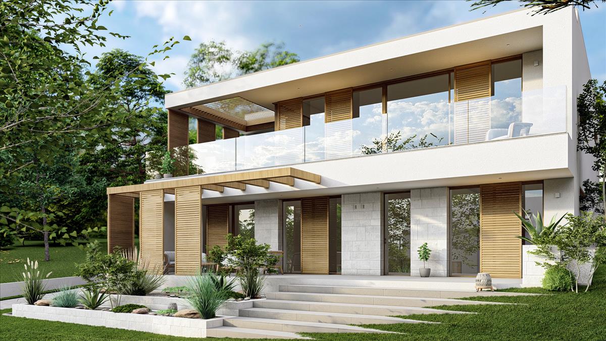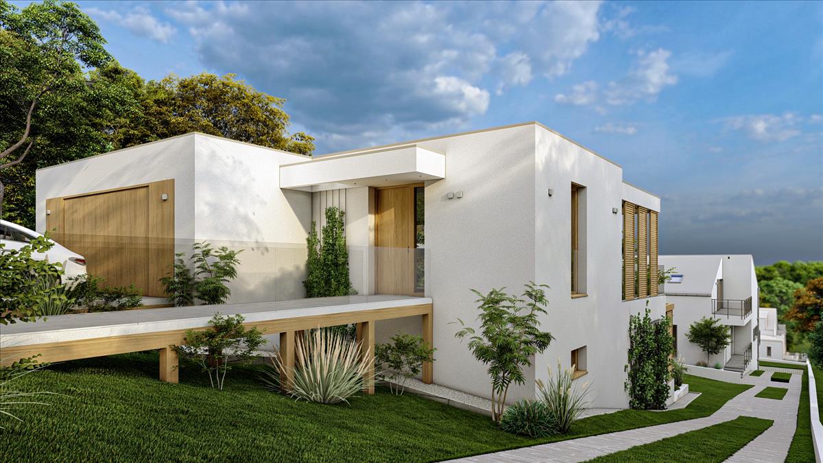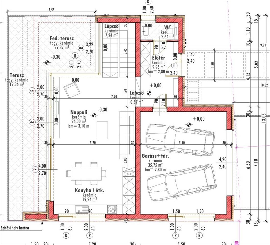dupla garázs, előtér, vendég w. C. , Amerikai konyhás nappali + 42nm -es kertkapcsolatos terasz.