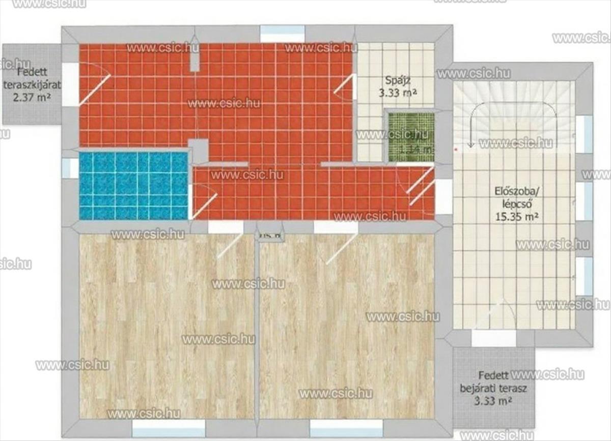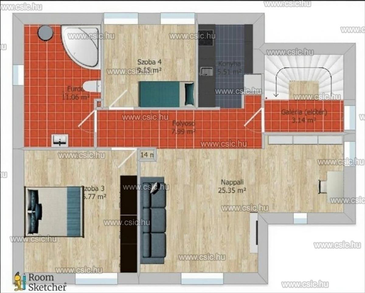 Az emeleten 3 szoba, konyha? Fürdőszoba, valamint folyosó, lépcsőház található.