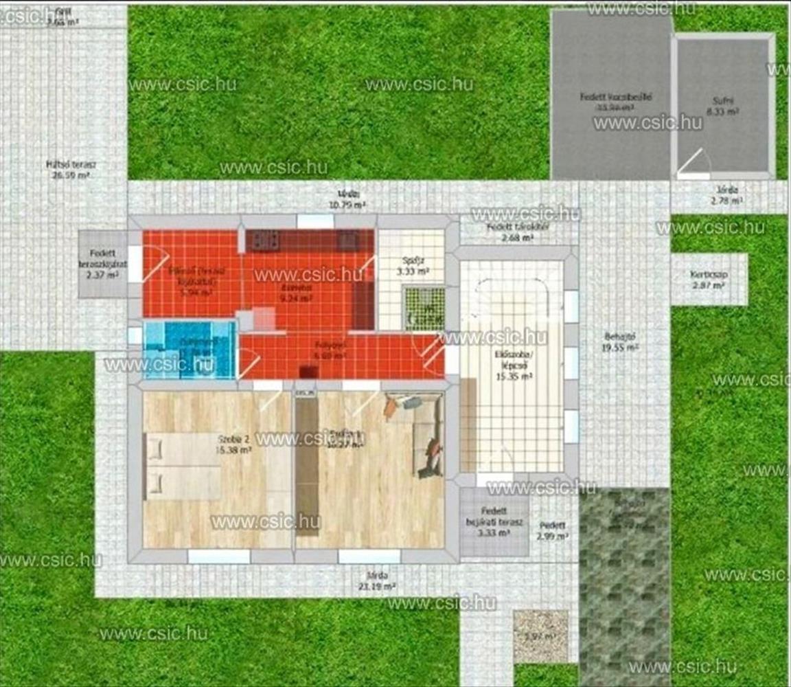 - automata kapu, 2-3 autónak udvari beállóhely az árban, fedett parkoló (14 nm ), tároló (8 nm ) az árban,