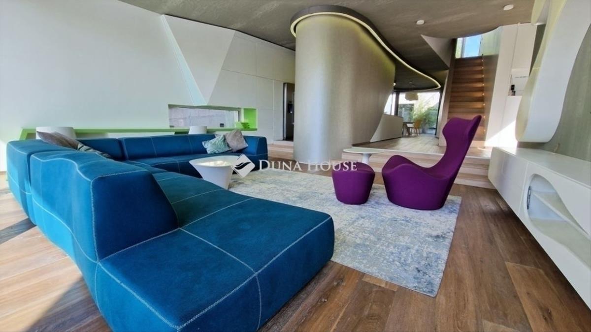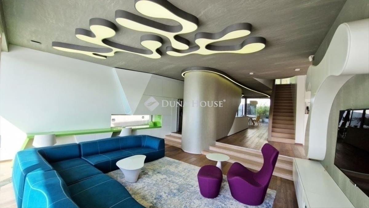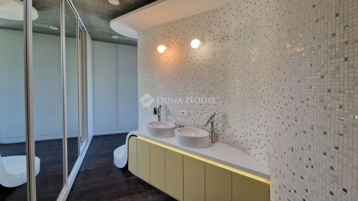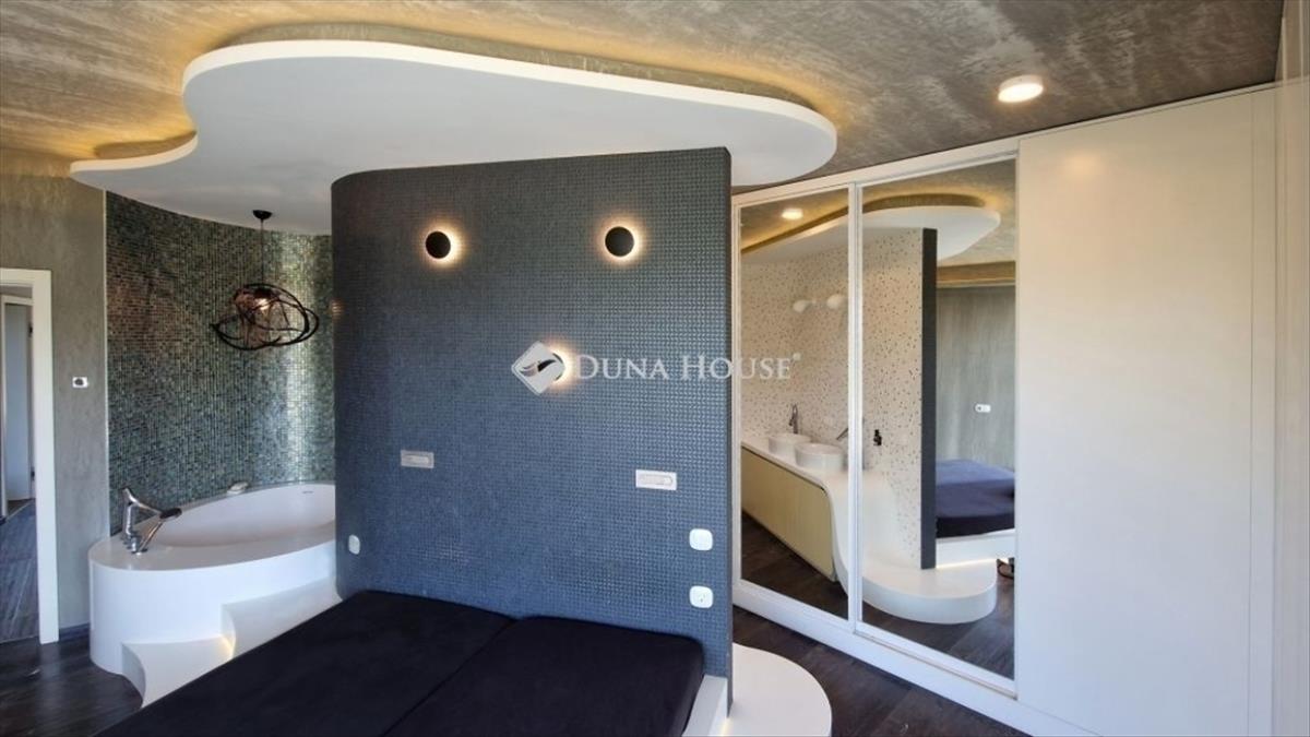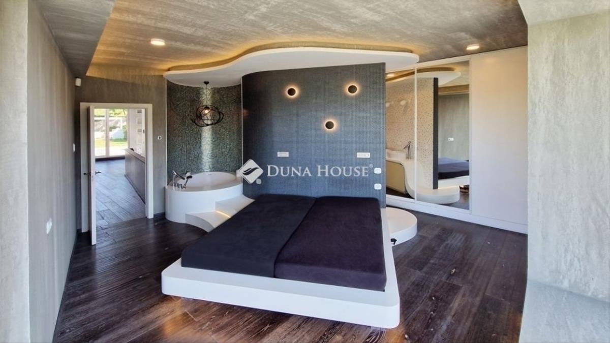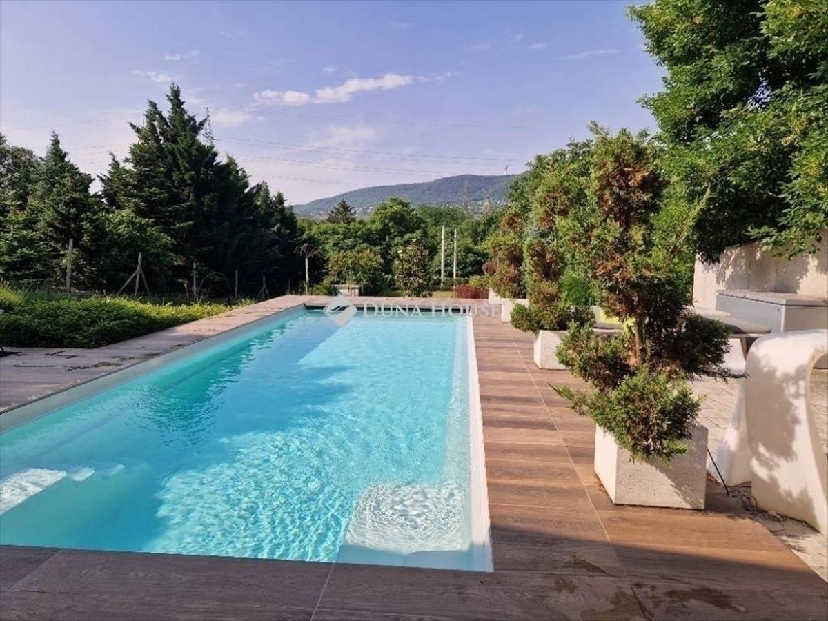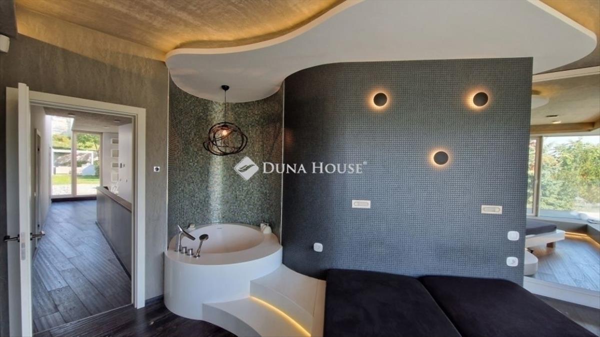 A földszinti 40 m2-es napsütötte, déli tájolású nappaliból tudunk kilépni a medencés teraszra. Az öntözőrendszerrel felszerelt, gyönyörűen parkosított kert igazi megnyugvást ad egy sűrű nap után. a házhoz tartozik kerti konyha, szauna, jacuzzi és saját fitness terem is.