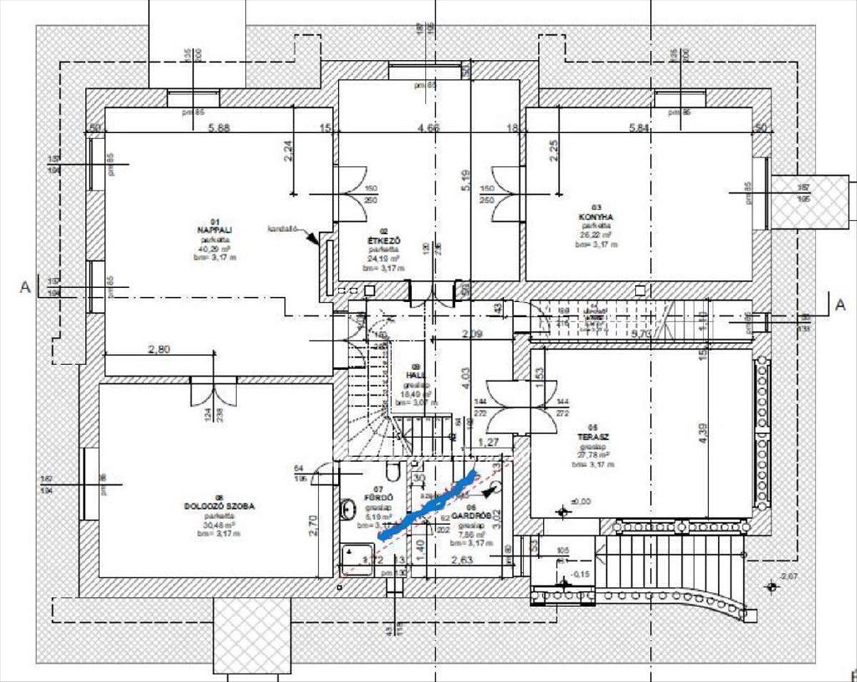 Az alagsori szinten garázs, szauna, mosókonyha, gépészeti helyiség és egy garzon lakás került kialakításra. Egy kocsi számára nyitott felszíni beálló is található. a ház felújítandó.