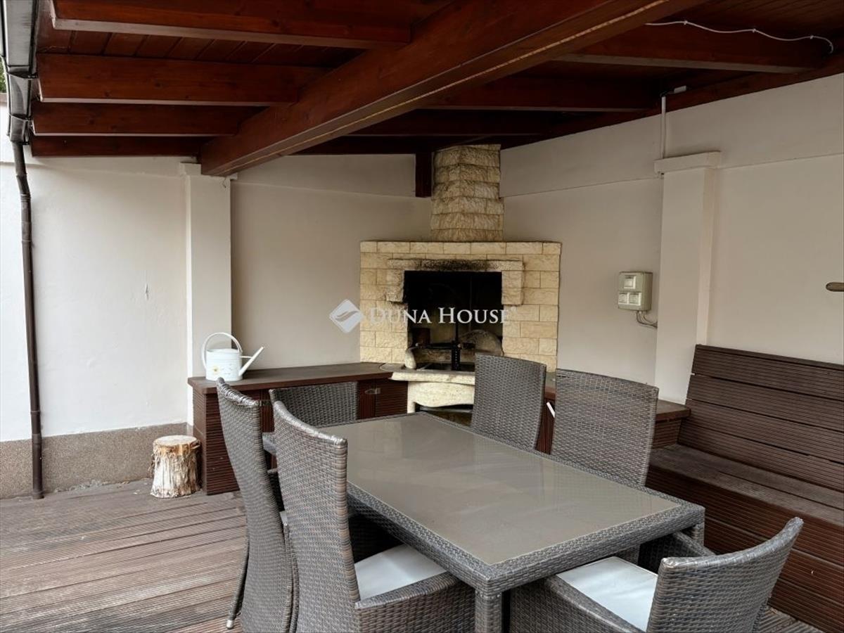 Az ingatlanhoz tartozik egy igényesen kialakított kert, amely épített medencével, fedett terasszal és kerti sütögetővel várja az új tulajdonosokat. a nappaliban található kandalló kellemes hangulatot biztosít a hidegebb napokon is.