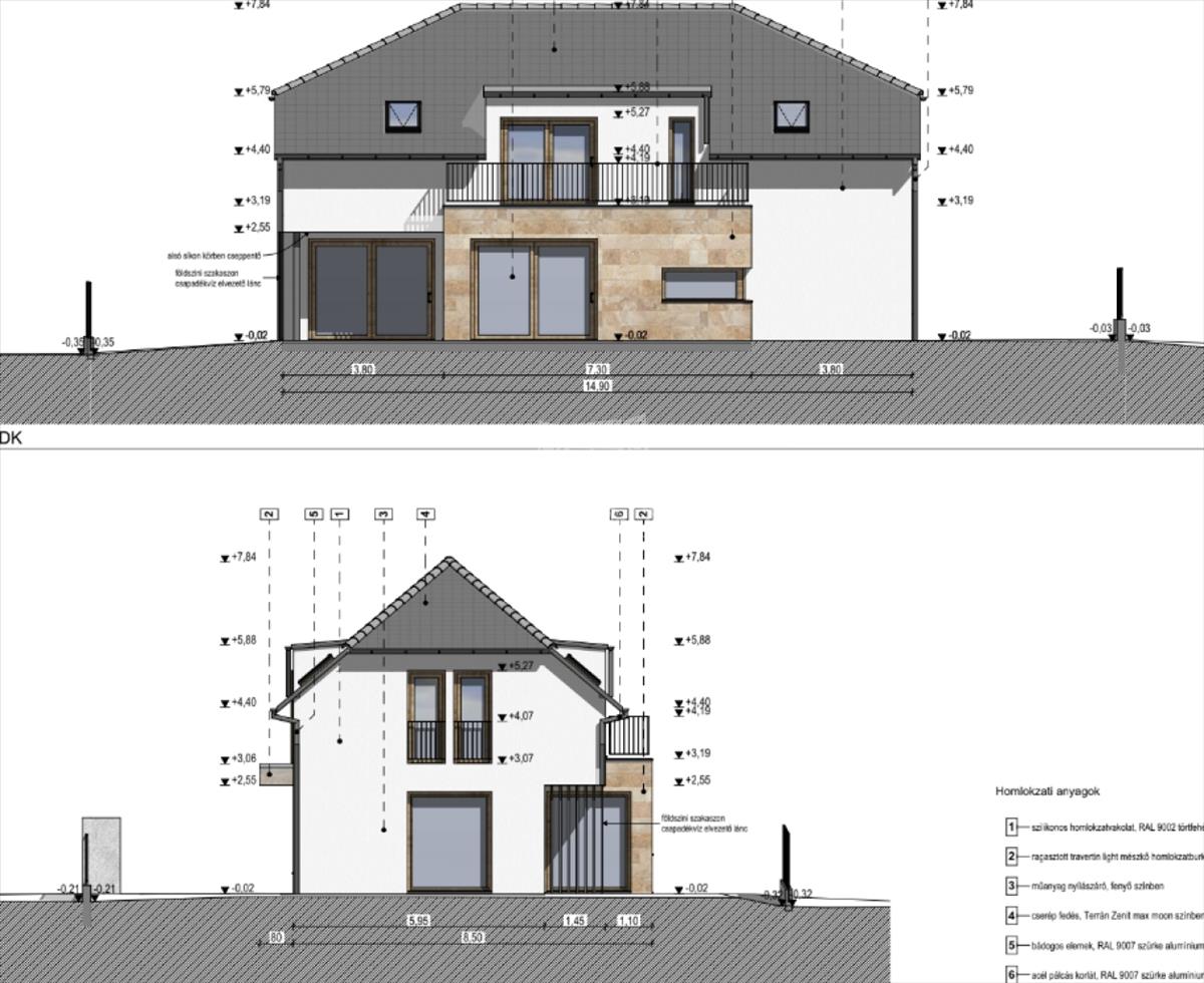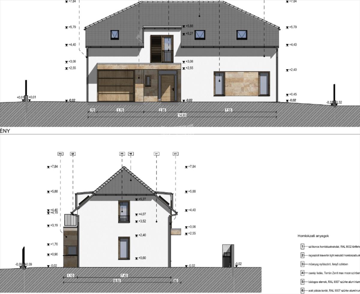A tető Terrán Zenit Max cserépfedést kap elegáns Moon szürke színben. a nyílászárók korszerű, háromrétegű hőszigetelt üvegezésű, fenyő színű műanyag szerkezetek, többpontos biztonsági bejárati ajtóval.
