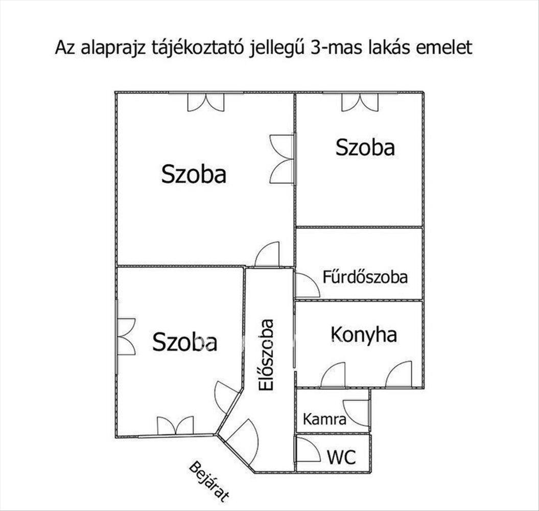 Elrendezés: 3 szoba, étkezős konyha, fürdőszoba, 2 külön wc, előszoba kondenzációs kazánnal fűthető.
