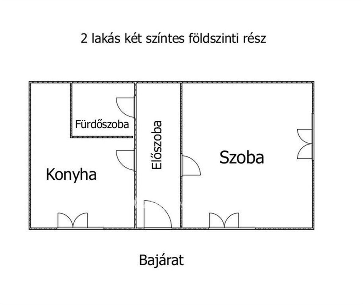 Alsó szint: szoba, konyha, kamra, fürdőszoba, előtér