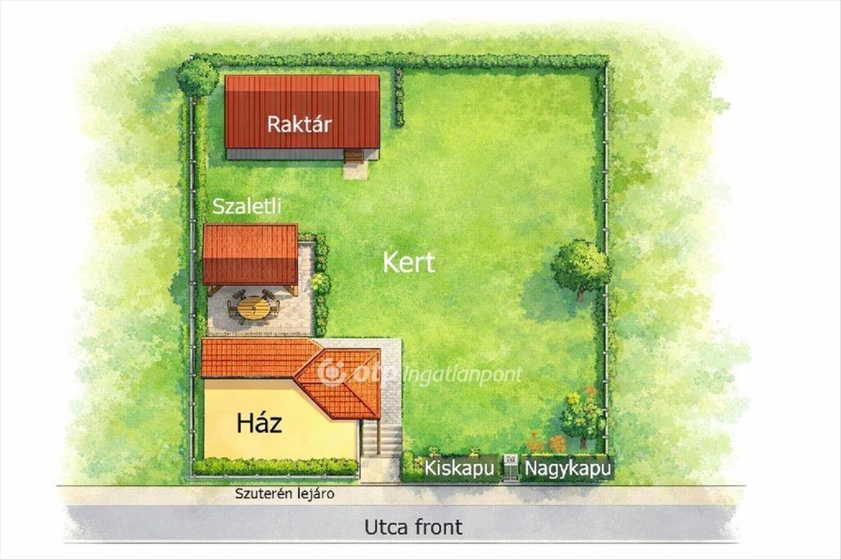 Különálló, könnyűszerkezetes raktár : 72 nm , a telek hátsó részében, teljesen elkülönítve Nagy teherautóval is megközelíthető. a kertben egy 25 nm -es szaletli. Gondozott kert kerti tavacskával. Térkövezett udvar és közlekedők 4-6 gépkocsi parkolása telken belül 3, 5 tonnás tehergépkocsi behajtása és parkolása is lehetséges. Utcán a parkolás ingyenes.