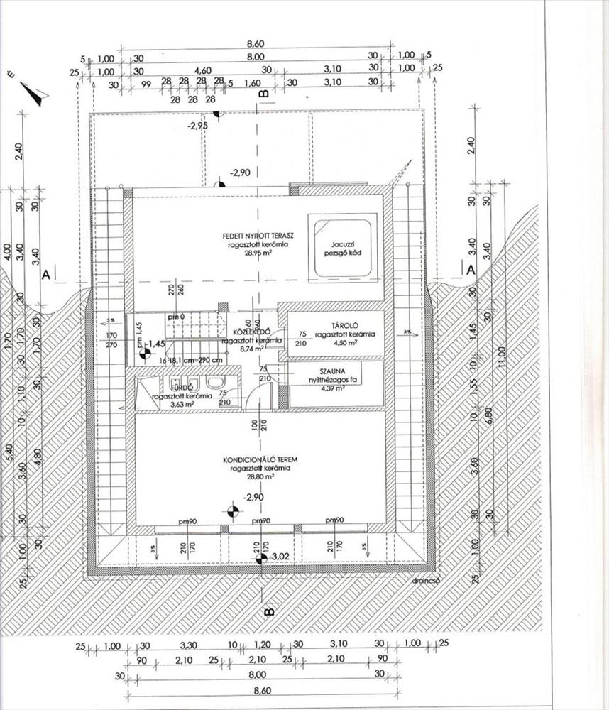 Lejtős telken támfalas kialakítás veszi körbe a házat ahol fényakna biztosítja a természetes fényforrást.