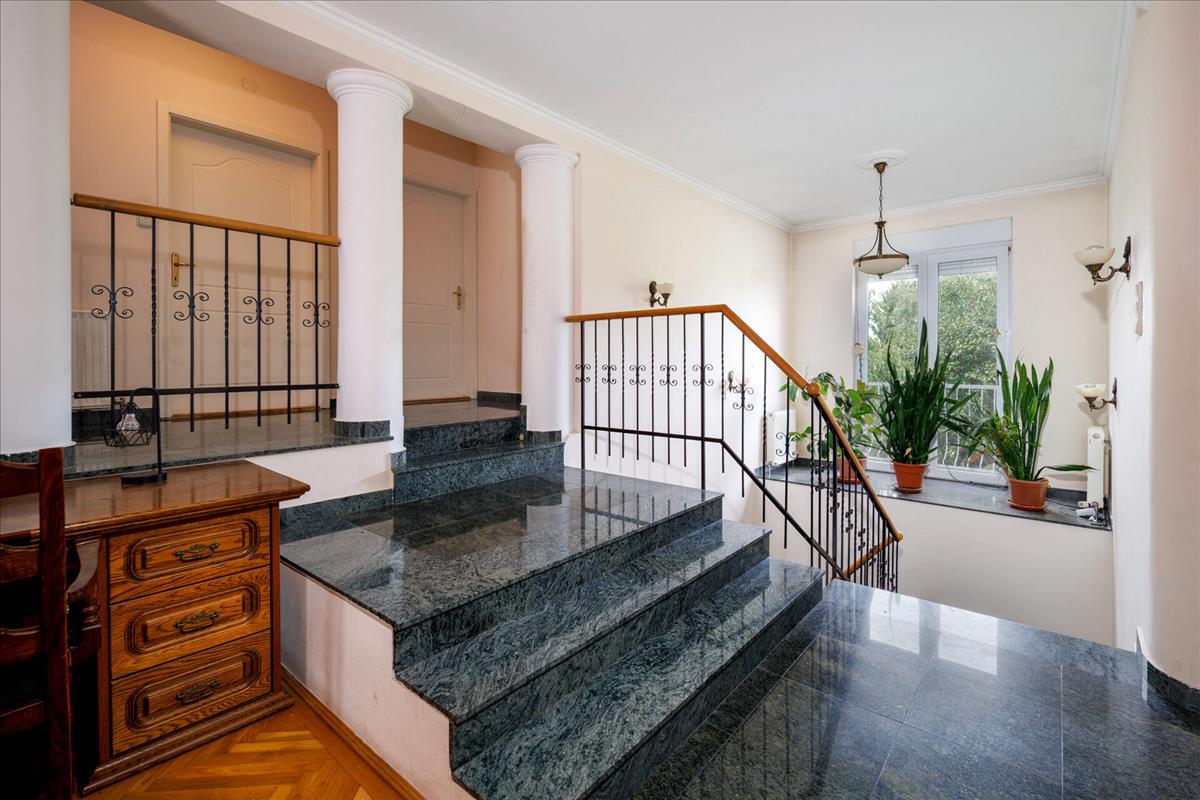 Az emeletre patinás, kovácsoltvas korlátos lépcsőn jutunk fel, amely a ház központi dísze is egyben. a felső szint is 122 m2-es, ahol szintén találhatunk egy tágas nappalit nagy erkéllyel, 4 erkélyes hálószobát, 2 fürdőt, külön mellékhelyiséget.