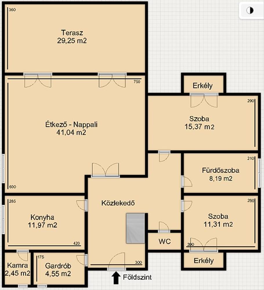 A bejáraton belépve a földszinten található 2 db halószoba, egy fürdőszoba, egy wc, egy konyha és egy 41 m2-es nappali, ahonnan nyílik a 29 m2-es terasz.