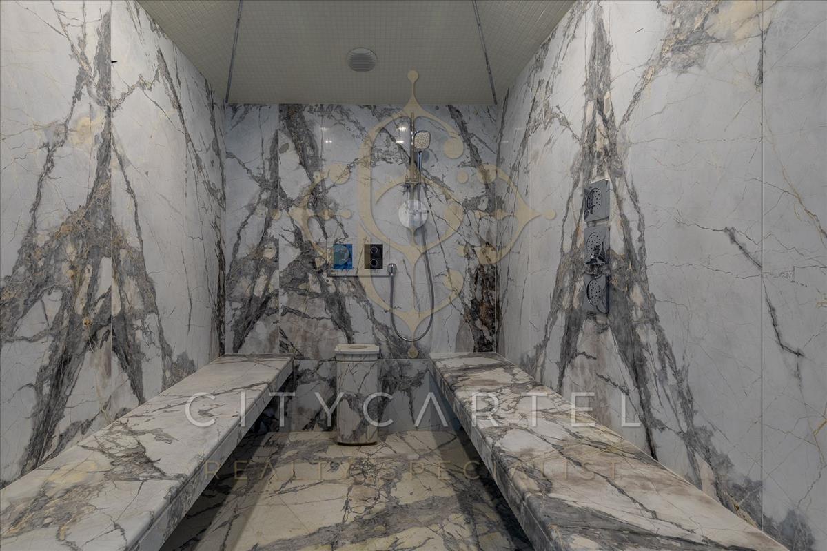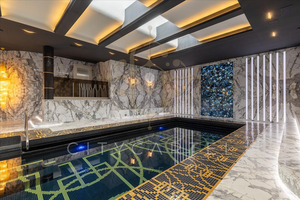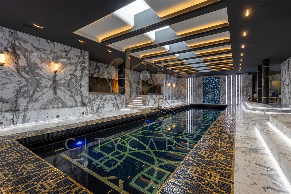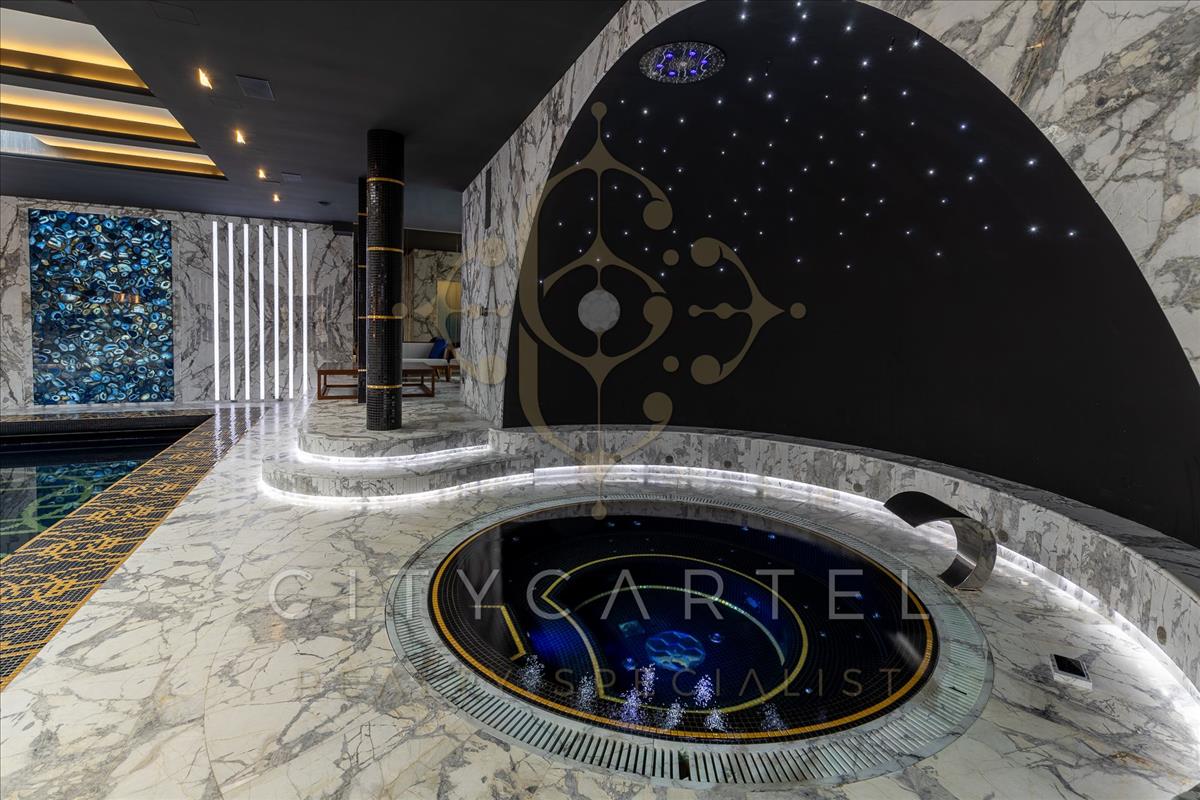 A villa minden részlete egy mestermű: a márvány, az ónix és a nemesfa harmóniája tökéletesen kiegészíti a modern technológiai megoldásokat. a reprezentatív, magas belmagasságú terekben a térérzet és a fény játéka uralkodik.