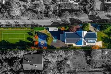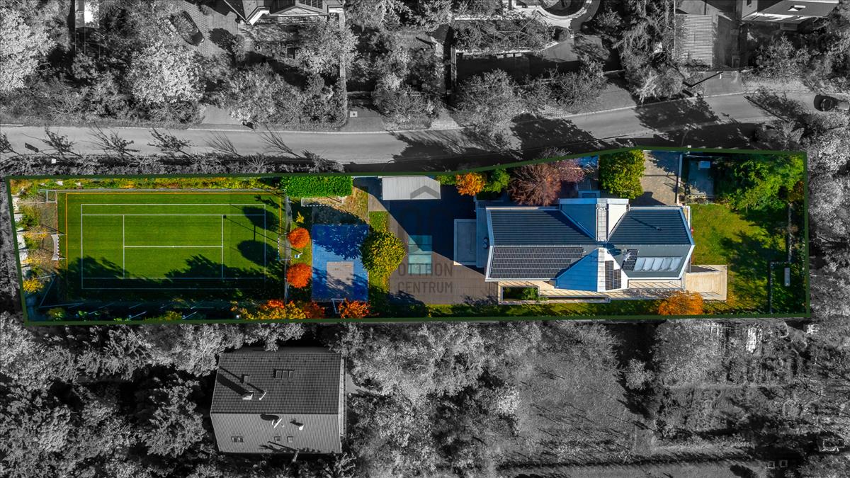 11 Szoba, 5 fürdő, 3 külön mosdó, tágas közösségi zónák, privát wellness és fitneszterem; a kertben saját teniszpálya és kosárlabdapálya, reflektorvilágítással.