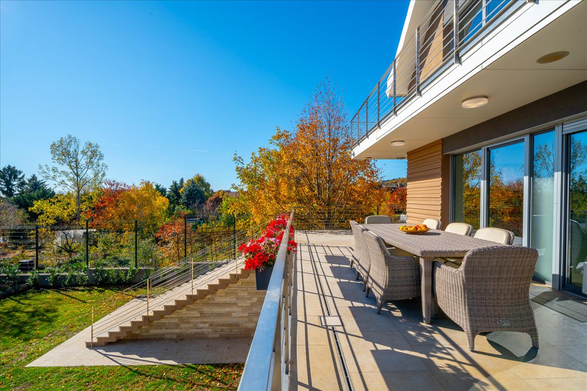 A terasz a belső tér természetes folytatása: vasárnapi ebédek, esti borozások, aranyló lombkoronák.