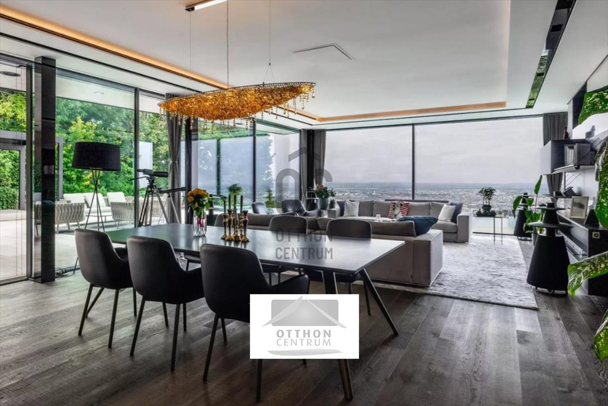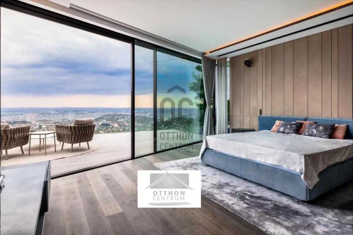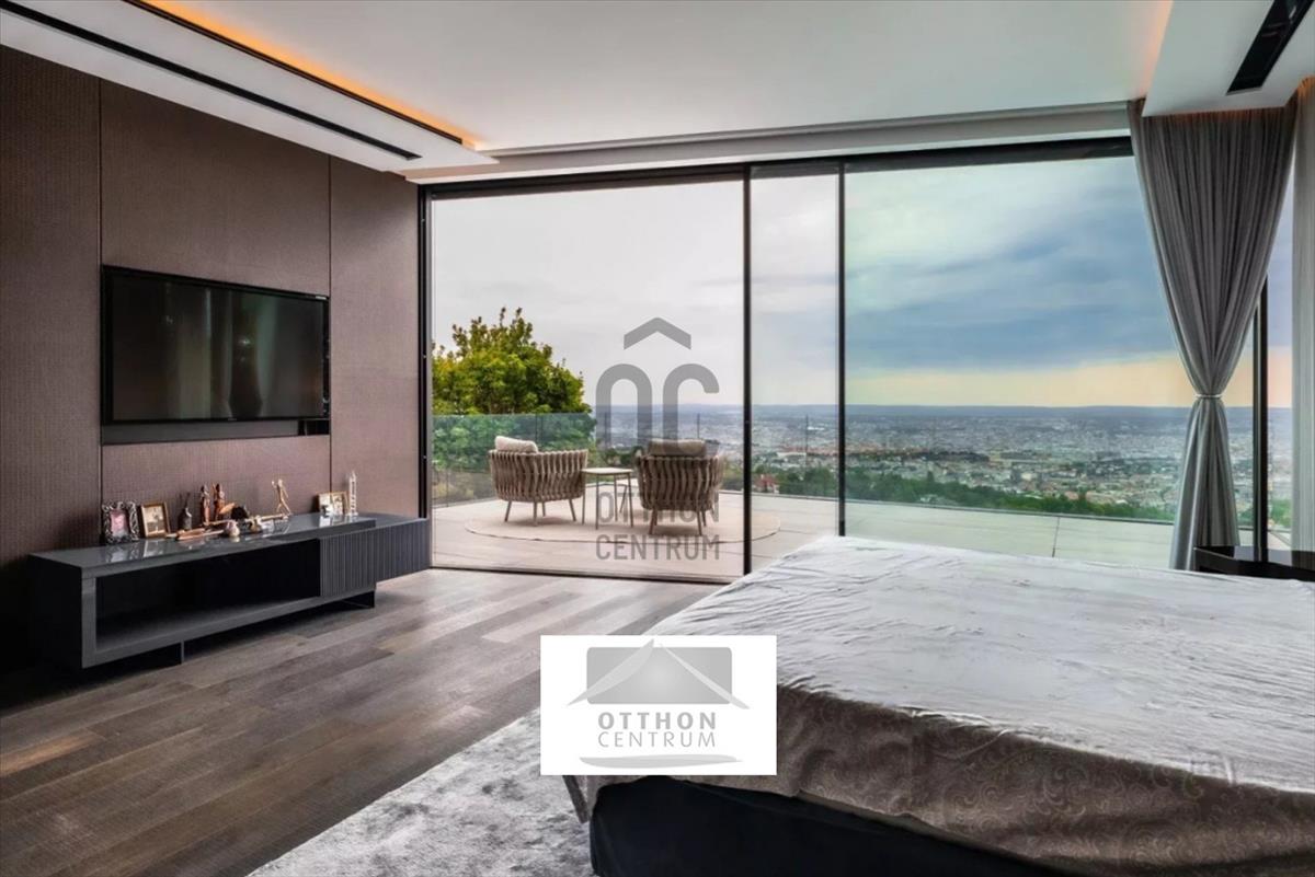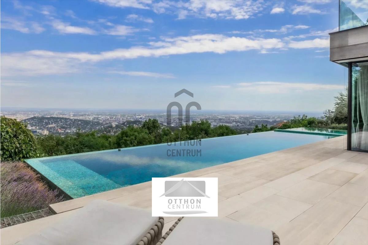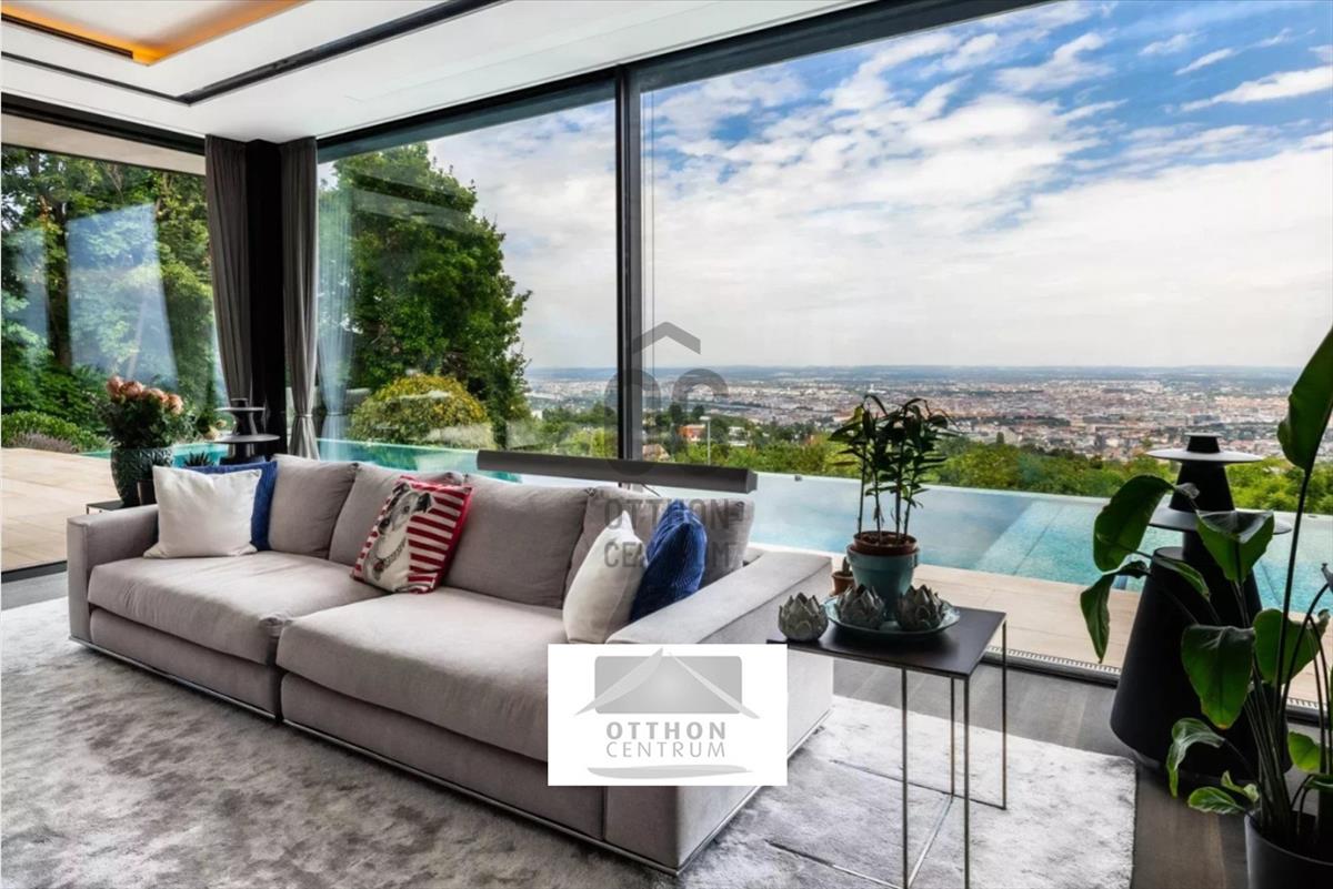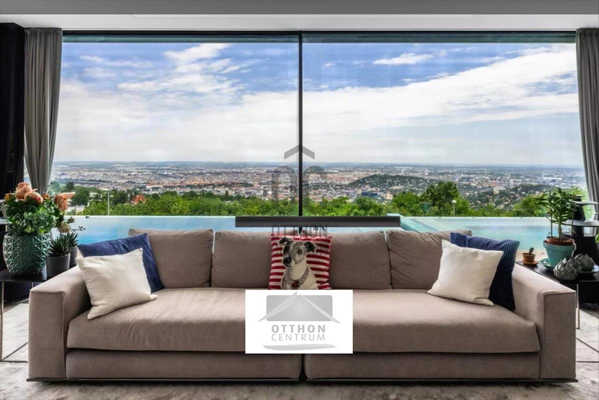 A Széchenyi-hegy déli lejtőjén a város felett, egy 1700 nm telken a földből nő ki ez a 746 négyzetméteres ingatlan, amely nem egy szimpla lakóépület, hanem nagy léptékű építészeti gondolatok és tekintélyes építtetői ambíció manifesztuma. Az épület panorámája lenyűgöző, többek között a Dunára, a Parlament épületére és a Budai Várra láthatunk rá a ház földszinti emeleteitől már.