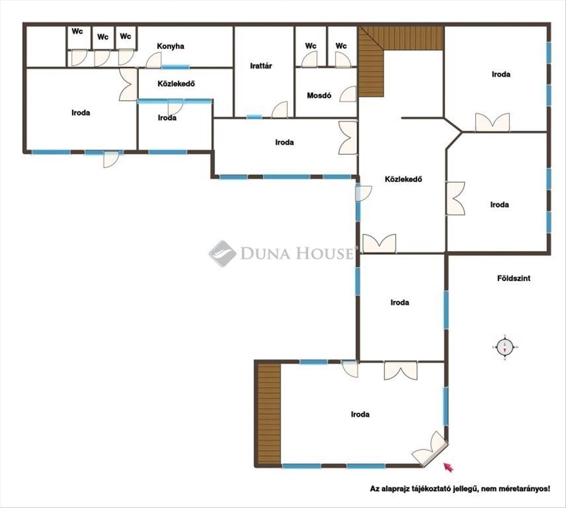 Földszint: recepció, 7 irodahelyiség, közlekedők, mosdók, irattár, kazánház Emelet: teakonyha, 2 irodahelyiség, mosdók, valamint jelenleg tárolásra használt padlásterek