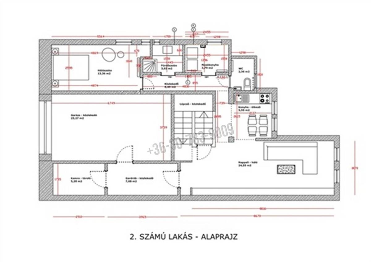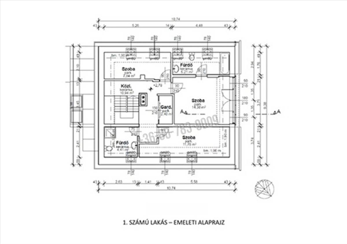Alsó szint (100 m²): amerikai konyhás nappali, hálószoba, fürdőszoba (wc külön és egyben), mosókonyha, gardrób-közlekedő, tároló, garázs