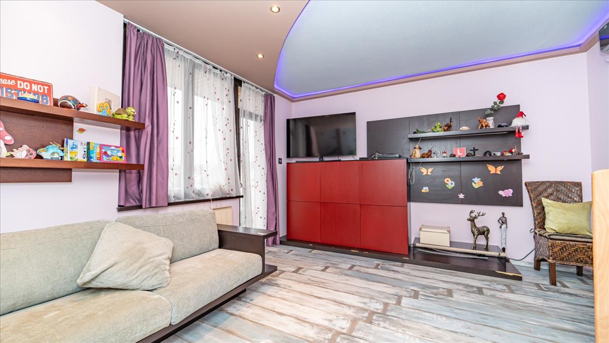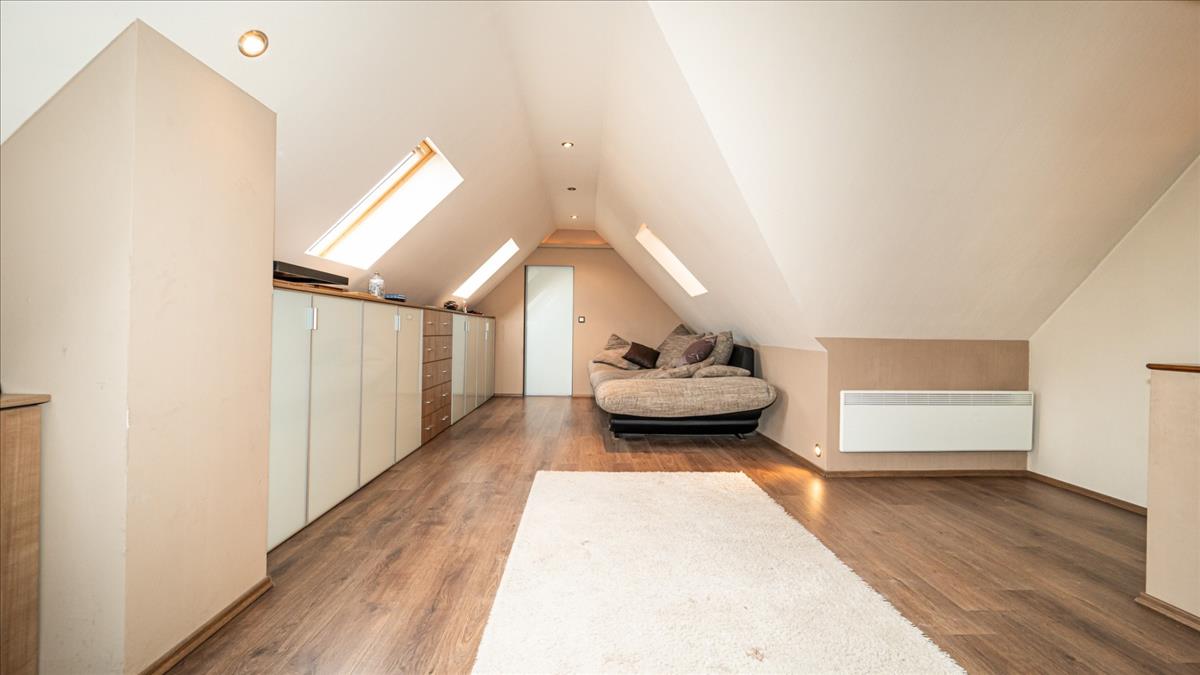 A tetőtérben jelenleg egy nagy játszószoba/pihenőszoba került kialakításra, a 20 nm-es pincében kapott helyett a fitness helyiség. Az emeleten is kialakításra került egy konyha, könnyedén két lakásossá is át lehet alakítani az épületet.