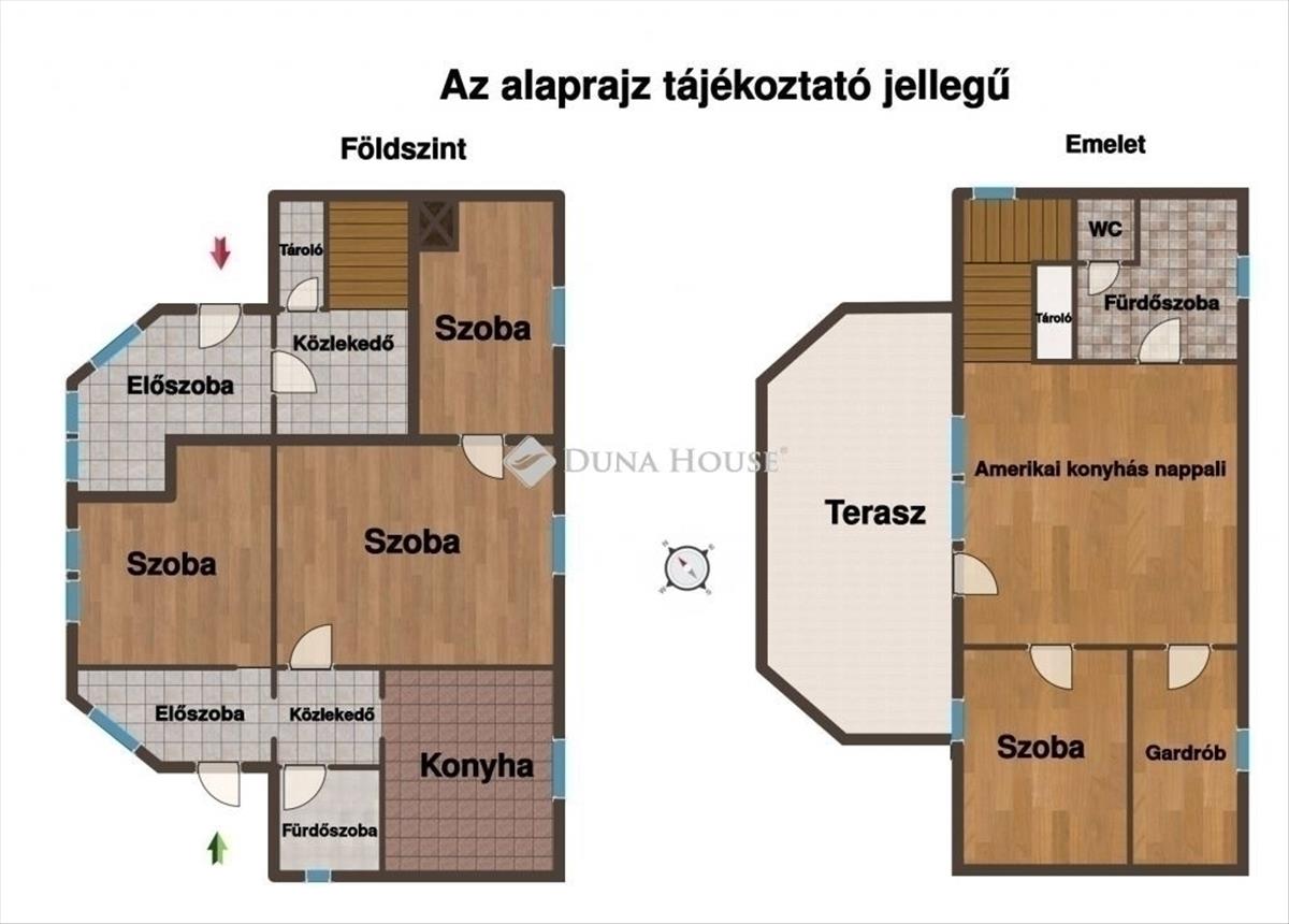 Mindkét szinten 3 szoba található ezek közül 1-1 hálószoba 1-1 nappali és a fennm aradók közül az egyik gardróbként funkciónál a másik gyerekszobaként.