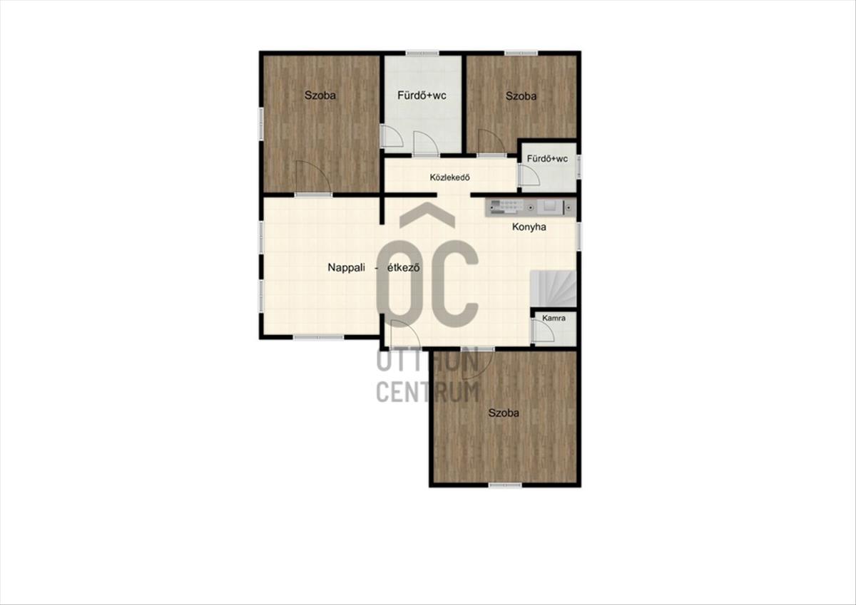 A földszinten 3 szoba, amerikai konyhás nappali, és két fürdőszoba-wc található.