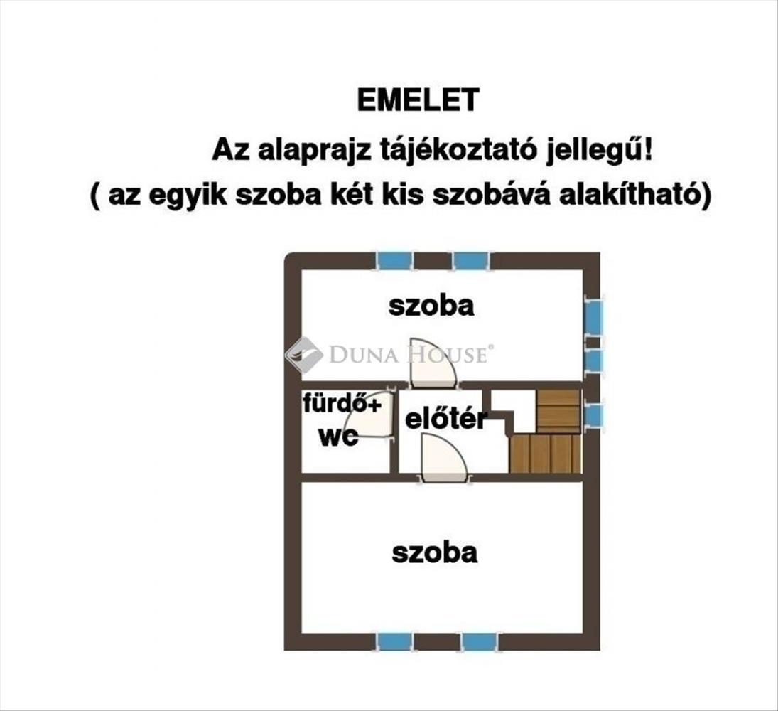Az emelti szintre kényelmes lépcsőn jutunk fel, egy előtérből jobbra is balra is egy-egy szoba került kialakításra, a bal oldali szoba régen két kis szoba volt, akár leválasztható. Ezen a szinten is fürdőszoba és wc is kapott helyet.