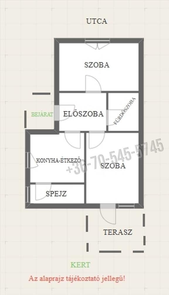 Az ingatlan praktikus kialakítású: két szoba, valamint egy tágas konyha-étkező ad otthont a mindennapi életnek, kiegészülve egy kamrával, valamint fürdőszobával, mellékhelyiséggel.