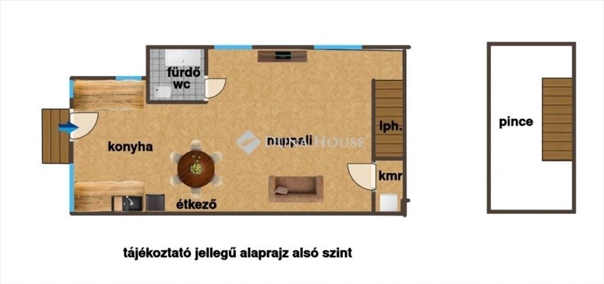 Az ingatlanba a kertből belépve egy tágas, napos nappaliba érkezünk egy étkezős konyhán keresztül, mely egy térbe van a nappalival. Kialakításra került egy vendég fürdőszoba ezen a szinten.