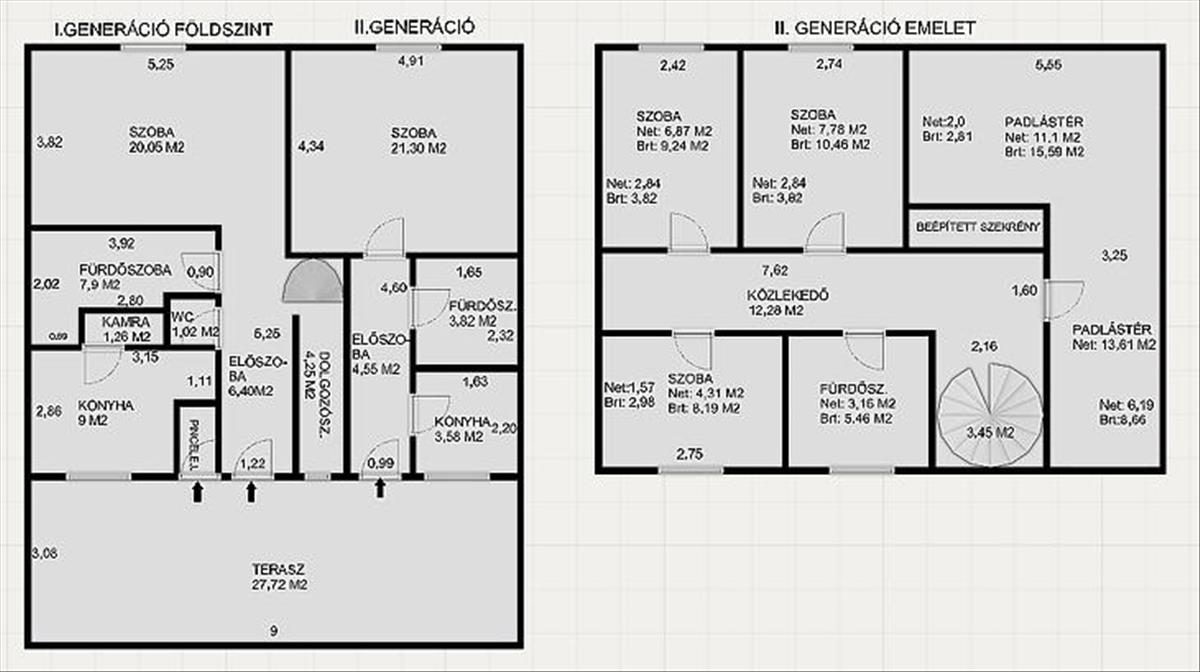 Az i. Generáció: belső két szintes 113 m2. a földszinti részen előszoba, dolgozószoba, szoba konyha, fürdőszoba, kamra, közlekedő és mellékhelyiség található. Az emeleten 3 félszoba, közlekedő, fürdőszoba és egy bővíthető padlástér (1-2 szoba még kialakítható) áll rendelkezésre.