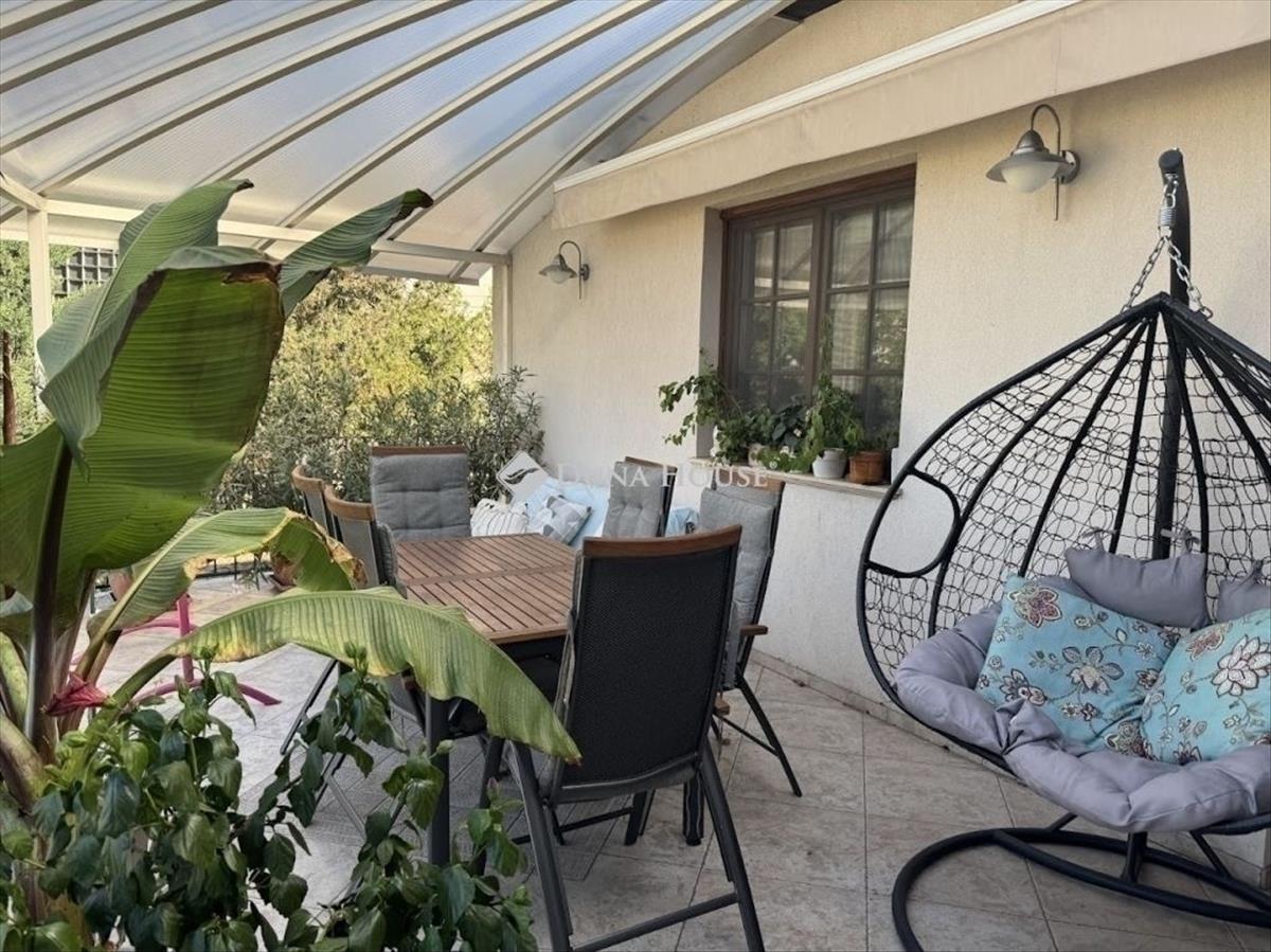 A teraszon automata árnyékoló van a terasztető alatt.