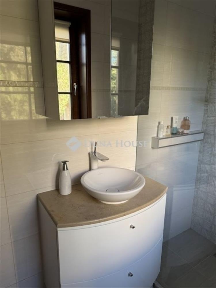 A szobákban egységes borovi fenyőből készült beltéri ajtók vannak. a fürdőszobákban Villeroy&Boch, Hansgrohe szaniterek kerültek beépítésre, a nagyobb alapterületű fürdőben a beépített szekrények tölgyfa frontosak, travertin mészkő munkalappal.