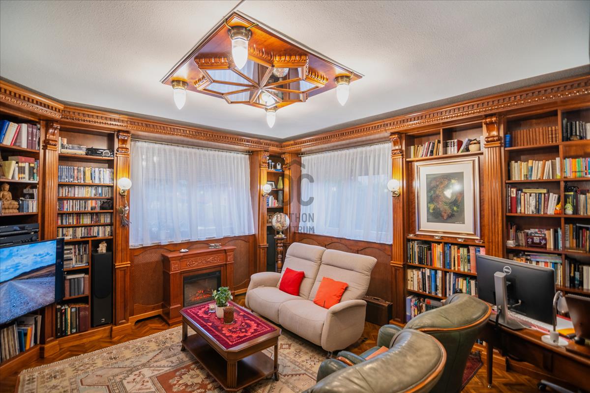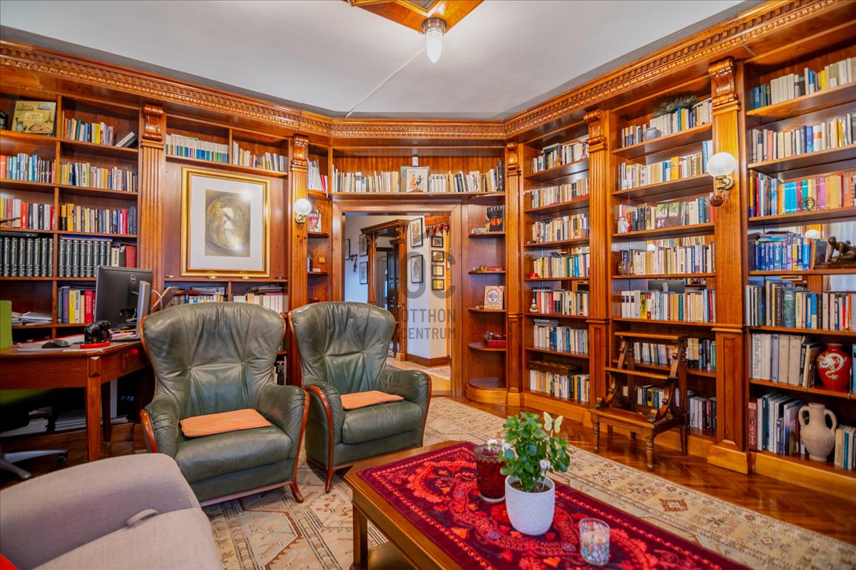 A földszint szíve az egyedi tervezésű könyvtárszoba – ideális esti beszélgetésekhez, családi együttlétekhez vagy egyszerűen elvonuláshoz.