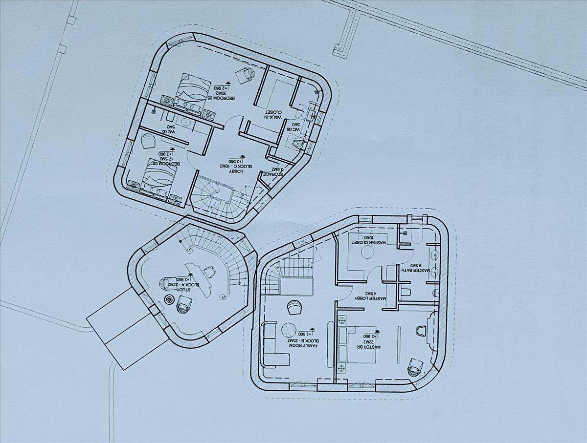 -Baloldali tömb (3 szint): Bal oldali lakásegység pince szinten szauna, konditerem, mosókonyha, kertész tároló lett kialakítva. Földszinten nappali és főhálószoba, emeleten két hálószoba kerül kialakításra. Mindegyik hálóhoz külön tartozik walk-in gadrób és vizes blokkal. a tömbhöz külön utcai bejárattal is megközelíthető.