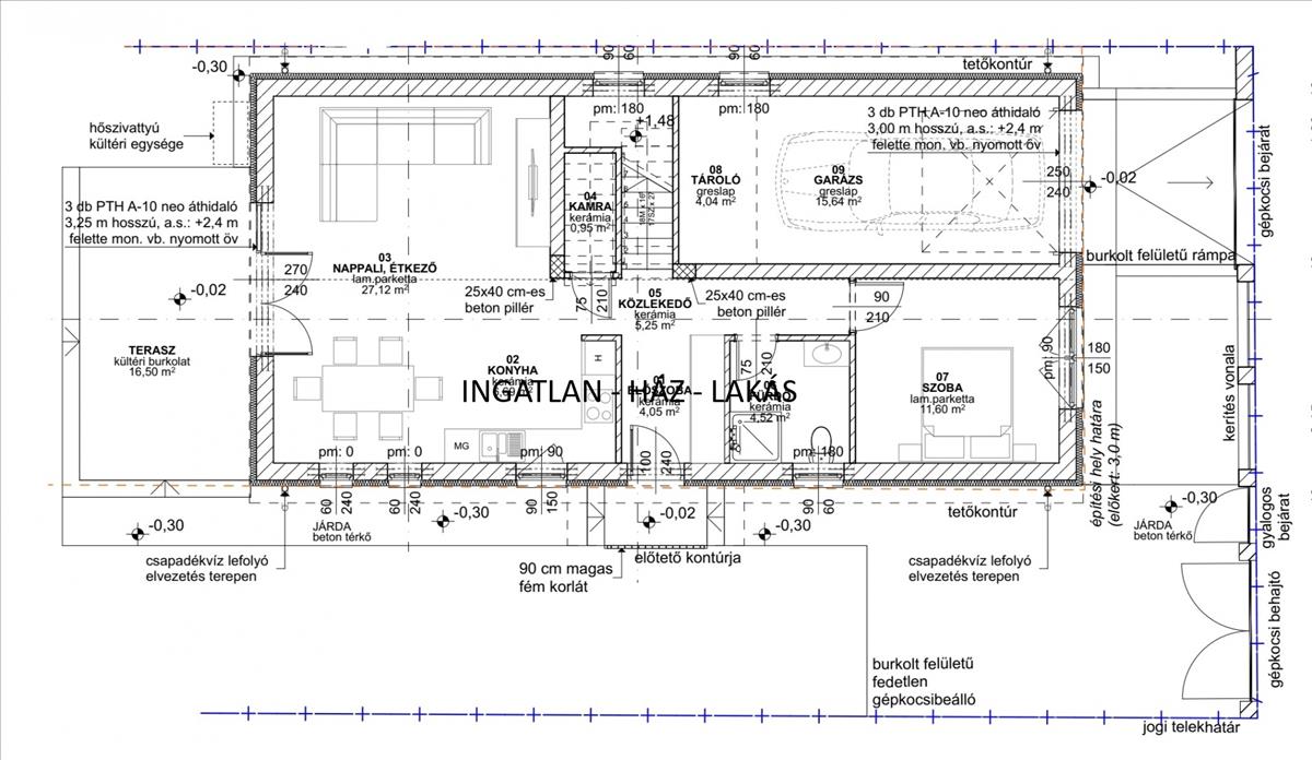 előszoba 4, 05 nm, közlekedő 5, 25 nm, fürdő 4, 52 nm, kamra 0, 95 nm, konyha-étkező-nappali 33, 81 nm, szoba 11, 60 nm tároló 4, 13 nm, garázs 15, 55 nm, terasz 16, 50 nm