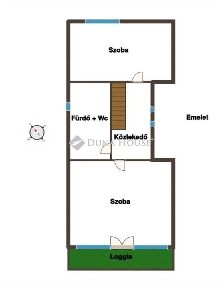 - Emelet: nappali loggiával, hálószoba, fürdőszoba