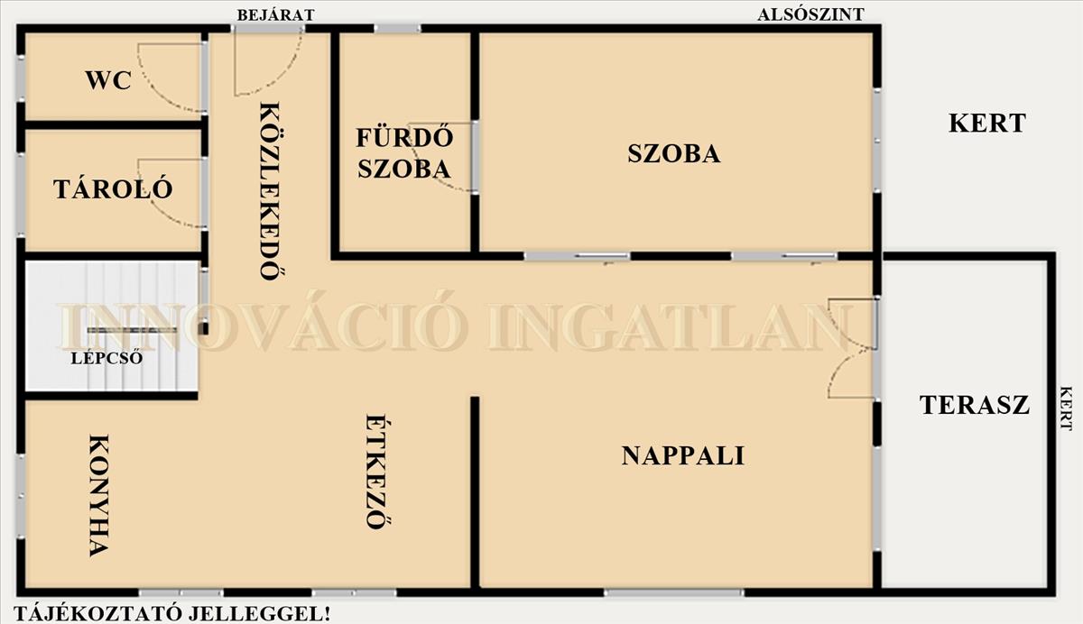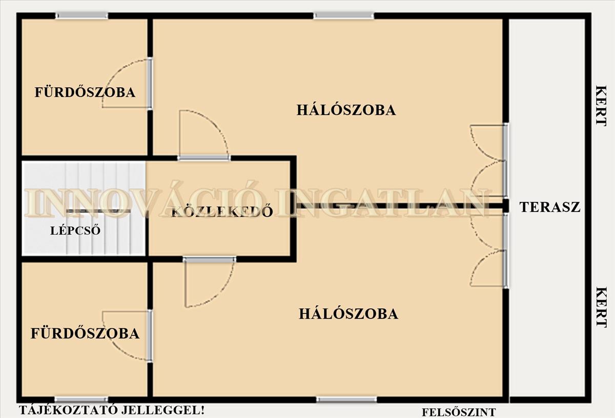 - tágas, étkezőrészes gépesített konyha, gardróbszoba, a terasszal és a kerttel közvetlen kapcsolatos nappali, hálószoba, ebből nyílóan fürdőszoba, plusz mellékhelyiség, előszoba elosztású,