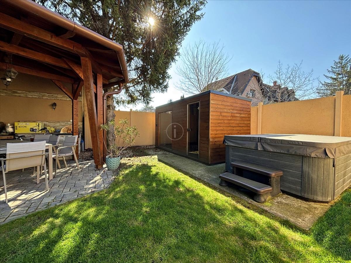 A kiváló lokációban, 555 nm összközműves telken lévő ingatlanok mérete összesen bruttó 190 nm . Az automata öntözőrendszerrel rendelkező, kertész által gondozott kertje a szomszédok által elzártan kialakított fedett grill terasszal, 4 személyes szaunával, 5 személyes jacuzzival, maximálisan élhető, minőségi kikapcsolódást nyújt.