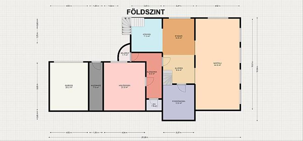 Földszint: Előtér, amerikai konyhás nappali, hálószoba, kamra, fürdőszoba, lépcsőház