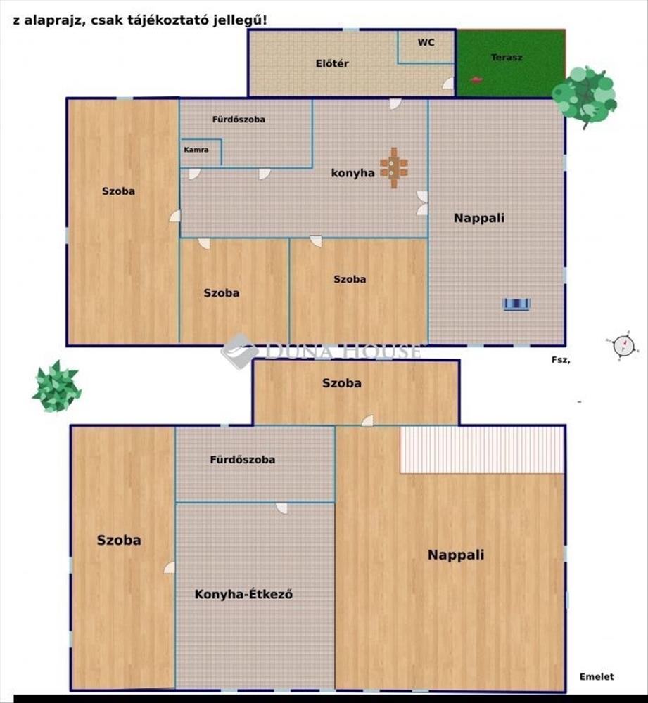 Kiváló elrendezés: mind a földszinten, mind az emeleten teljes értékű lakótér található – külön konyhával, tágas nappalival, fürdőszobával és két hálószobával.