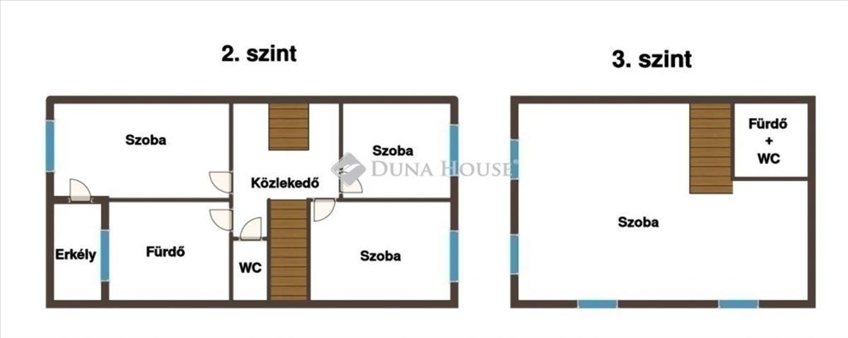 Első emelet: 3 különnyíló szoba és egy fürdőszoba WC-vel.