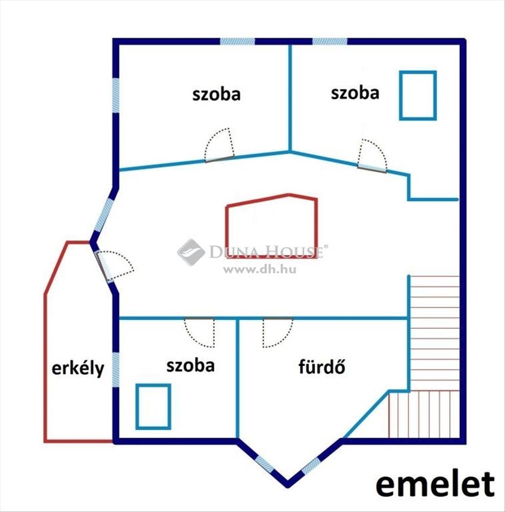 A földszint és az emeleti szint között áttörték a mennyezetet, így még nagyobb térérzetet biztosítva mindkét emeletnek. Ezen a szinten található 3 hálószoba, melyből az egyik esetében egy tágas gardróbszoba is kialakításra került. Az emeleten kádas fürdőszoba és wc található. Az emeleti erkélyről szép kilátás nyílik a kertre, illetve a környék villaépületeire.