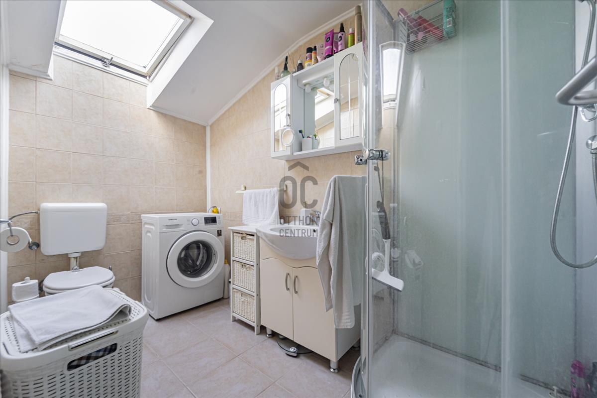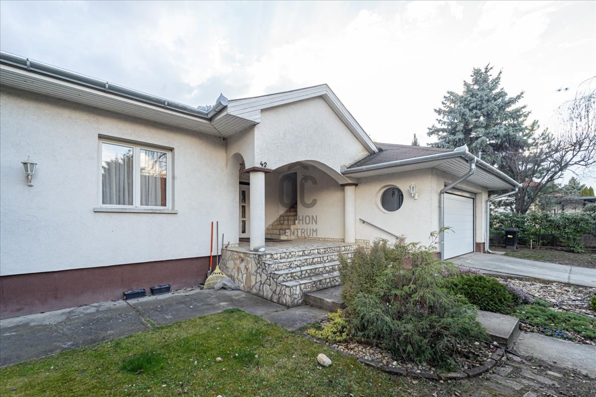 Csendes, családi házas részén eladó egy 2000-ben, 1005 nm -es telekre épült, DNY-i fekvésű, tehermentes, önálló, téglaépítésű ház. Külön bejáratú a két ingatlan. Fenti szinten egy 50nm -es garzon lakás található utólagos ráépítéssel ami tovább bővíthető. Az alsó szint 140 nm lakóterület, amely 4 szoba, előszoba, konyha, két fürdőszoba, gardrób, valamint 36 nm két beállású garázsból áll. Valamennyi szoba egy 70 nm -es teraszra nyílik.