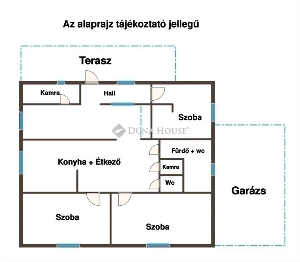 A ház elosztása praktikus és otthonos: három különnyíló szoba biztosít kényelmes privát tereket, míg a nagy méretű, étkezős konyha a családi élet központja lehet, felszerelt konyhabútorral és közvetlen kamrával. Az ingatlan egy fürdővel WC-vel, illetve egy különálló vendég-WC-vel is rendelkezik, ami nagyban megkönnyíti a mindennapokat.