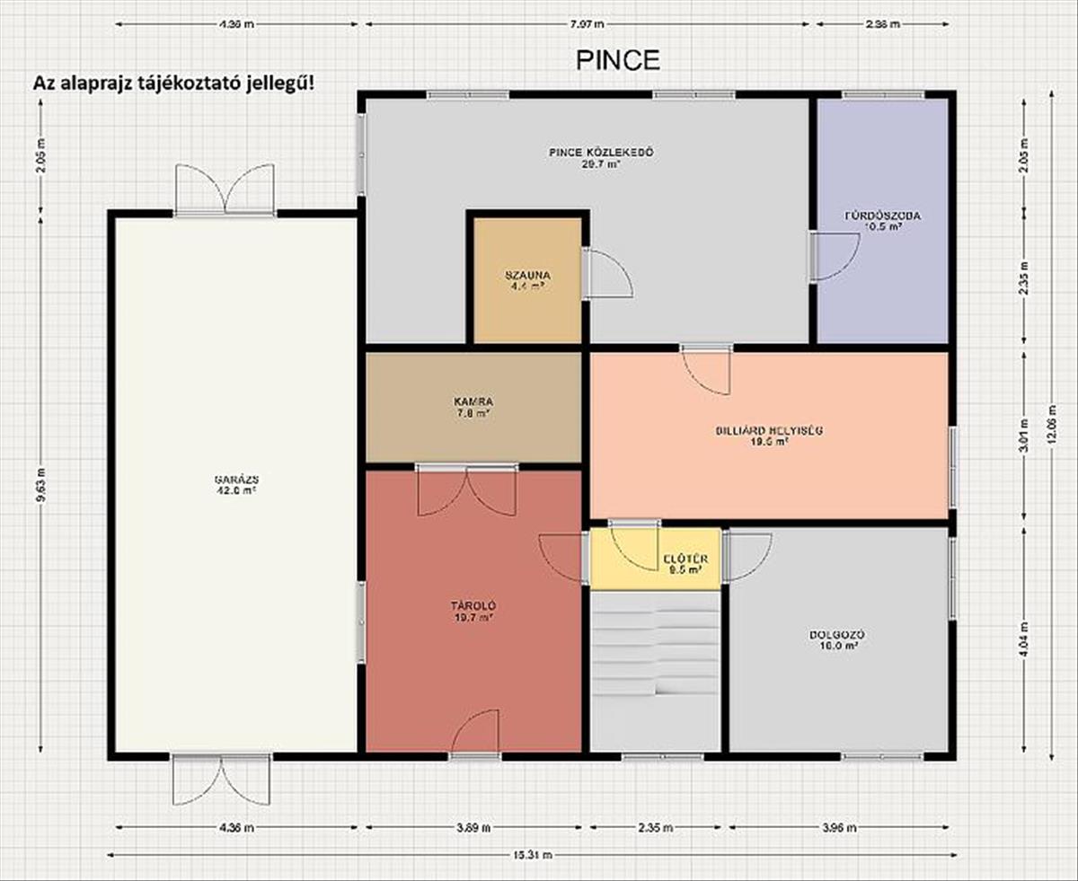 Az épület három szinten helyezkedik el. a földszint 144 m² alapterületű, ahol előtér, nappali, két hálószoba, konyha, étkező, fürdőszoba, külön mellékhelyiség és terasz található. Az emelet 126 m²-es, itt egy előtér, hat hálószoba, valamint egy mellékhelyiséggel ellátott fürdőszoba került kialakításra. a pince szint 114 m²-es, ahol közlekedő, szauna, fürdőszoba, kamra, dolgozószoba, biliárd helyiség, tároló és garázs kapott helyet.